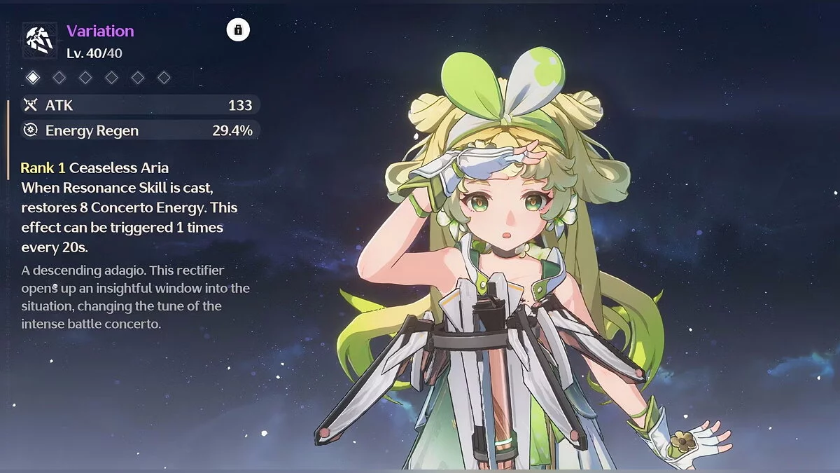 Вариация (Variation). Четырёхзвёздочное ректификатор, который наносит урон 27-337 единиц и обладает бонусом к восполнению энергии в размере 11,5-51,8%. Навык резонанса восстанавливает концертную энергию на 8-16 единиц. Подобное явление может возникнуть 1 раз в 20 секунд.