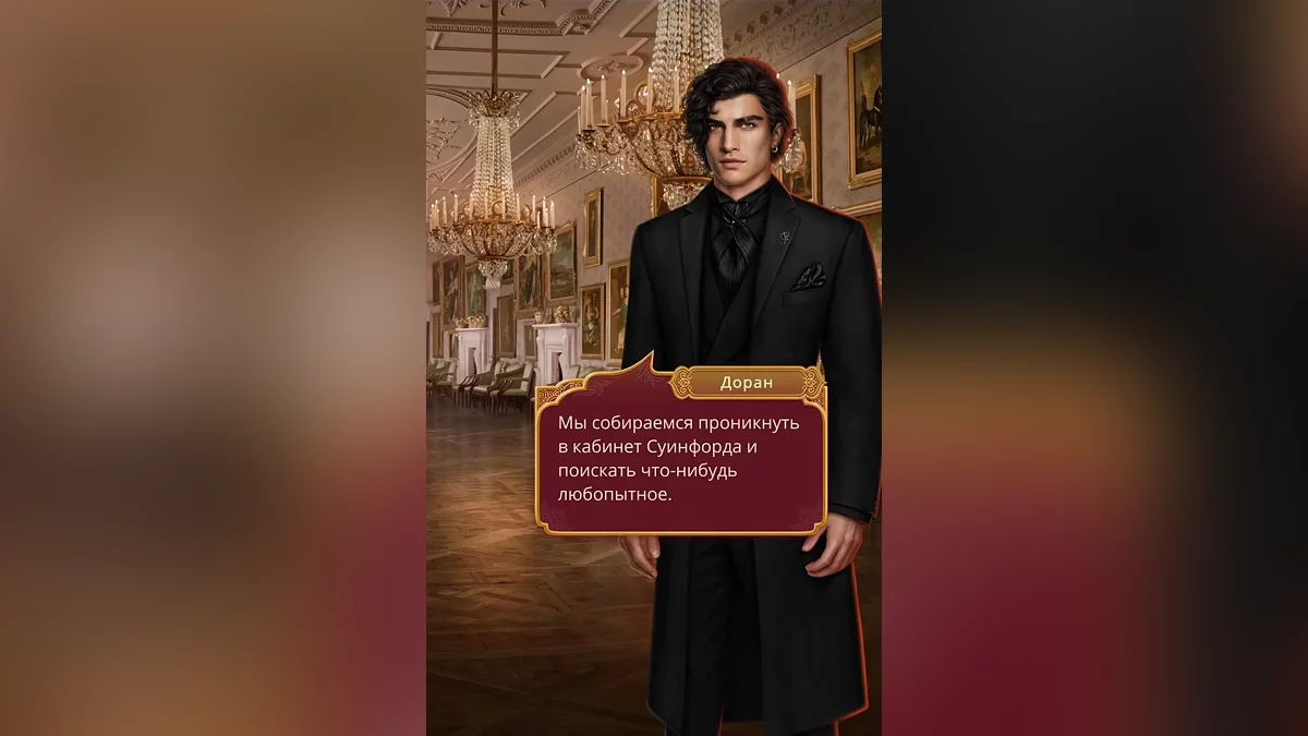 Возвращаясь обратно в зал, Дивия поняла, что заблудилась. Выйдя в очередной коридор, она заметила Камала и Дорана, которые очень подозрительно выглядели, стоя у закрытой звери с отмычками в руках. Мужчины попросили им помочь, чтобы не попасться с поличным, пока они осматривают кабинет лорда Суинфорда.