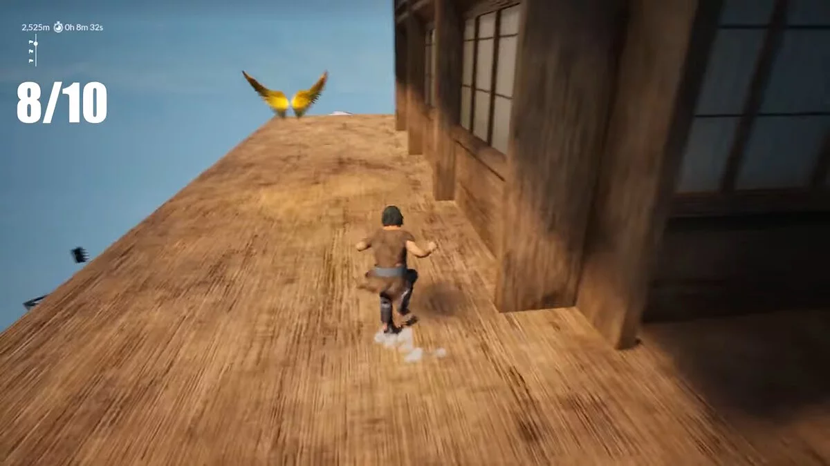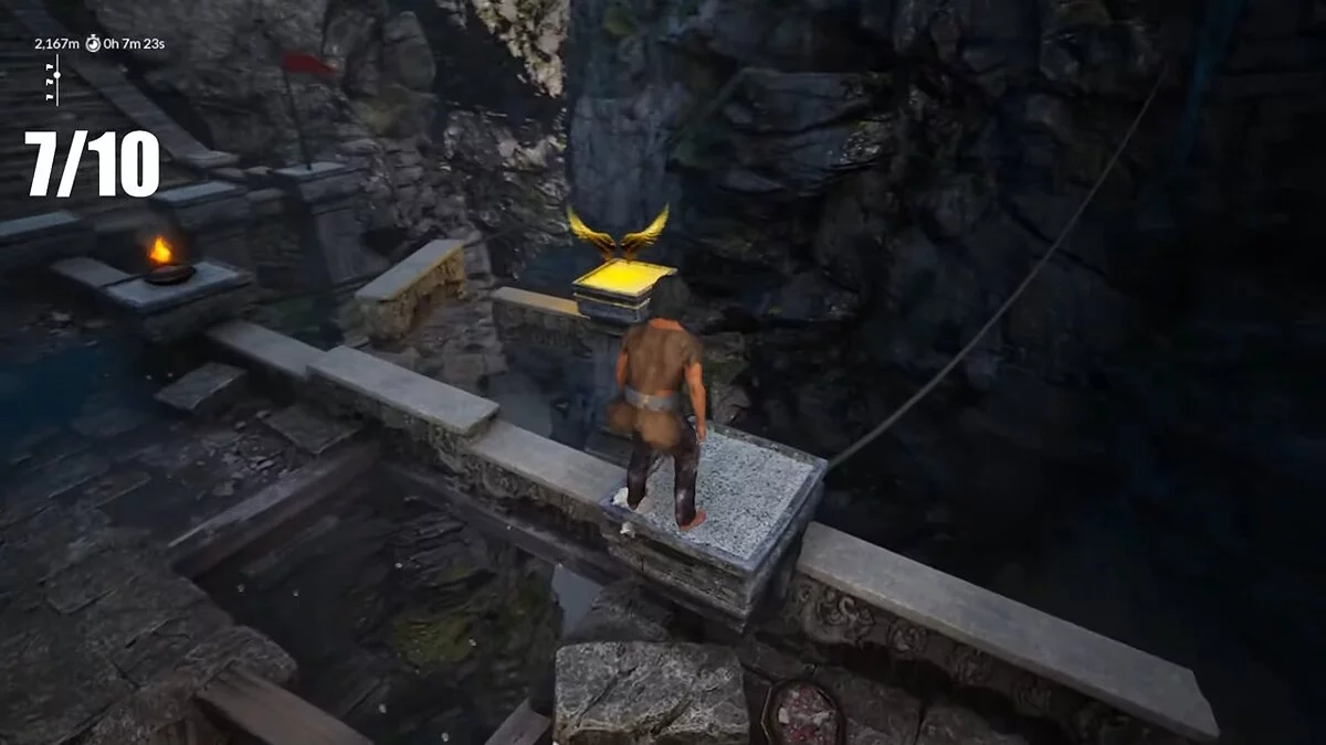 На высоте 2100 метров будет спуск вниз, где вы встретите сломанный деревянный мост. Перепрыгивайте его и заберитесь на небольшую платформу справа (на скриншоте герой стоит именно на ней). Платформа, на которой располагаются крылья, довольно далеко от моста, так что вам придётся правильно рассчитать траекторию, чтобы заполучить их.
