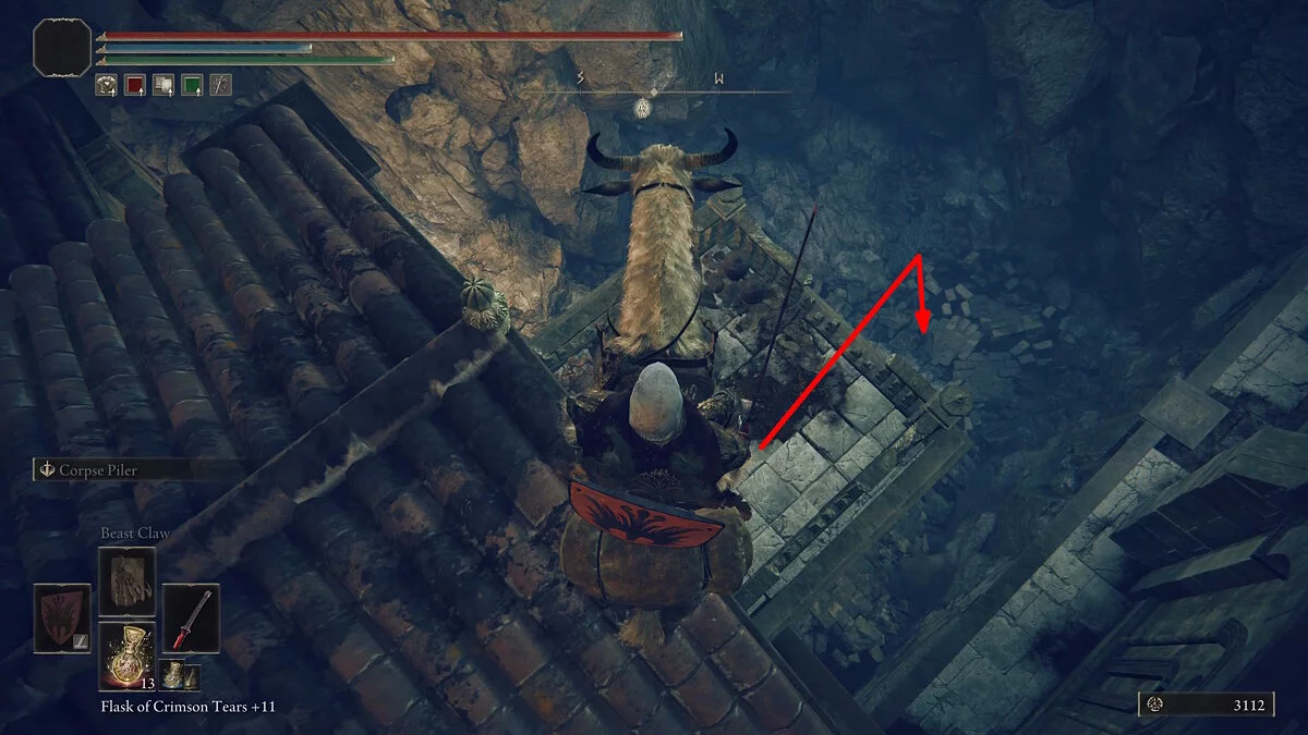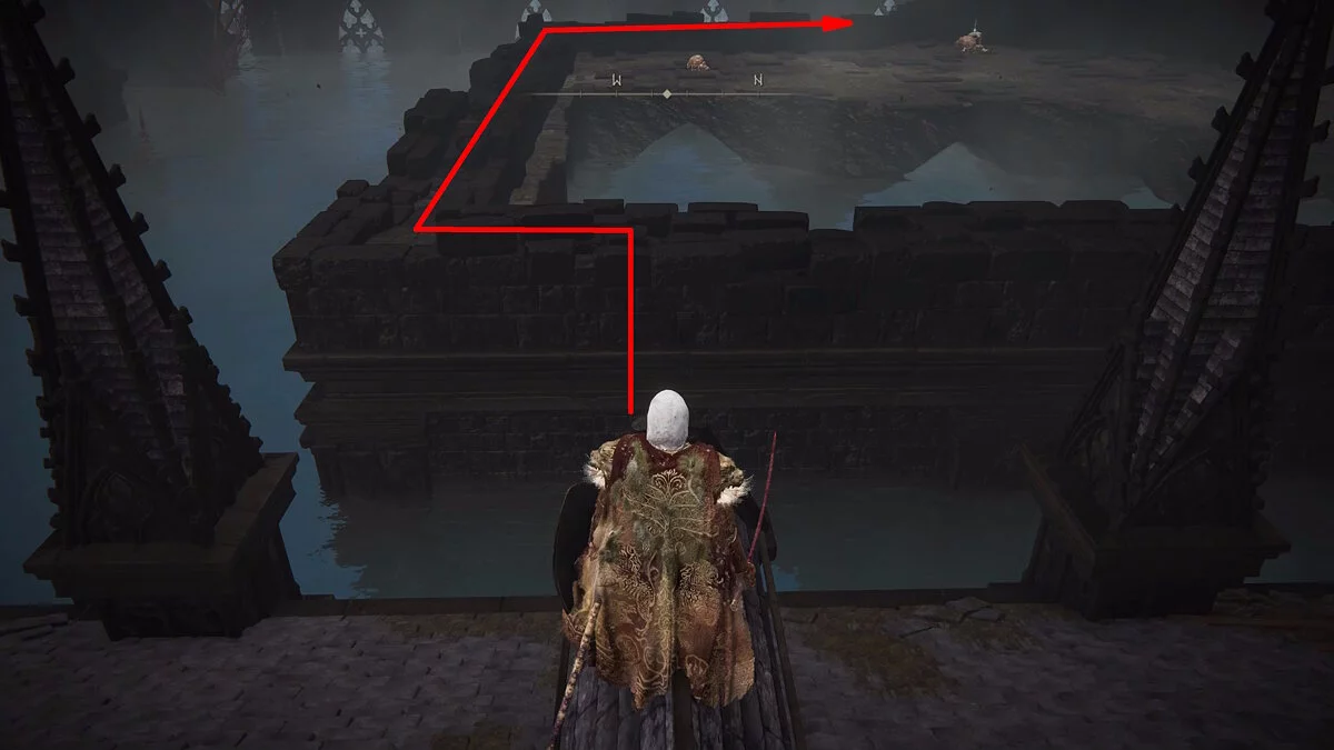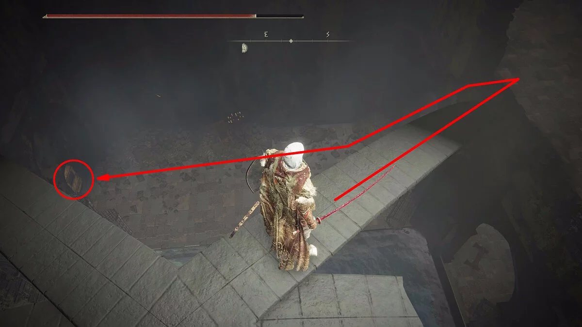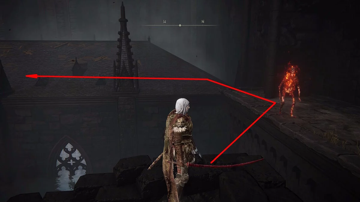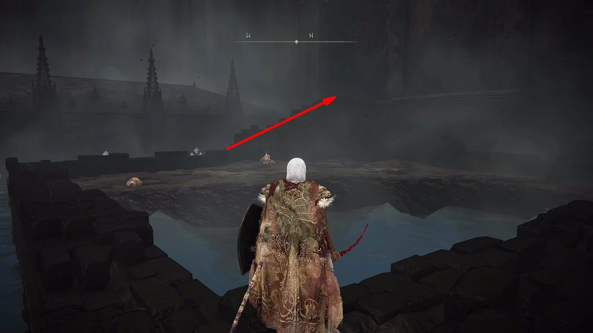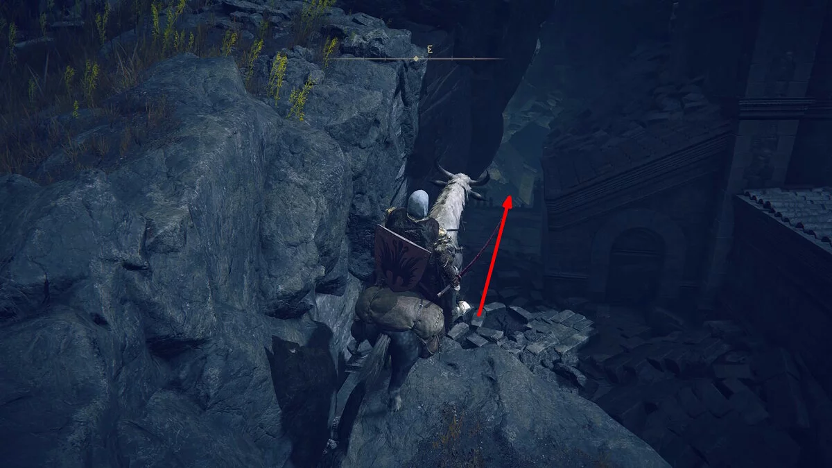 Двигайтесь по северо-восточной стороне этого здания, а затем спуститесь в пропасть. Здесь есть туннель, ведущий к лестнице — придется подняться по этой конструкции.