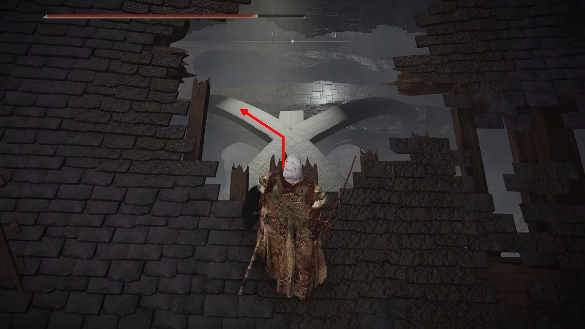 После активации Места Благодати в Церковный Район нужно спрыгнуть на крышу, которая находится под ним, и пройти на ее дальнюю сторону. Здесь следует встать на один из выступов крыши и прыгнуть на стену впереди. Теперь двигаемся к дальней стороне стены, поворачиваем направо и используем пандус из обломков, чтобы добраться до приподнятого выступа.