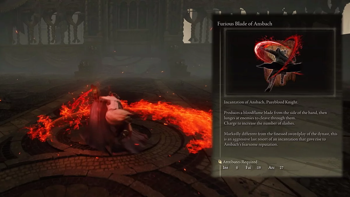 Некоторые виды магии в Elden Ring заменяют холодное оружие. К ним относится клинок Ансбаха. Он позволяет сражаться как мечником и проводить комбо. Если вы — опытный чародей со ставкой на Веру, то это заклинание может служить дополнением к дальнобойным чарам. Оно может пригодится, если противник слишком быстрый и не позволяет кастовать.