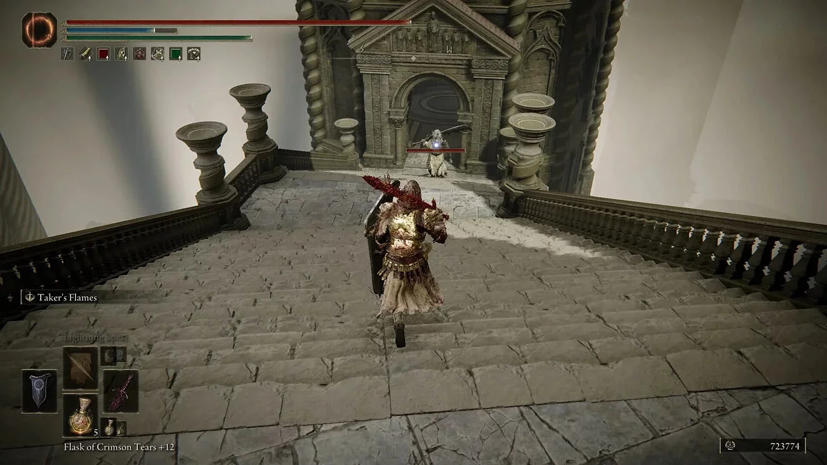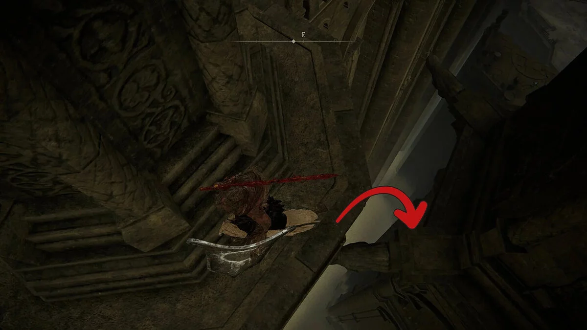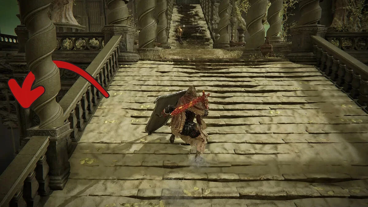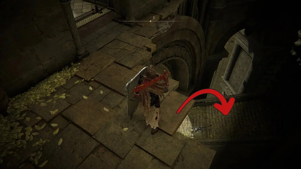 Как только вы достигнете конца арок, осторожно обойдите угол, чтобы найти ближайшую башню на юге, подождите выступающих горгулий и спрыгните вниз, чтобы приземлиться на нижнем выступе. Отсюда вы можете посмотреть на юго-восток и увидеть сломанную лестницу, ведущую к большому двору со статуей — здесь вы найдете фрагмент Скадутри (Scadutree Fragment), который вам обязательно стоит подобрать по пути. Спрыгните на лестницу и идите на площадку, где дорога расходится.