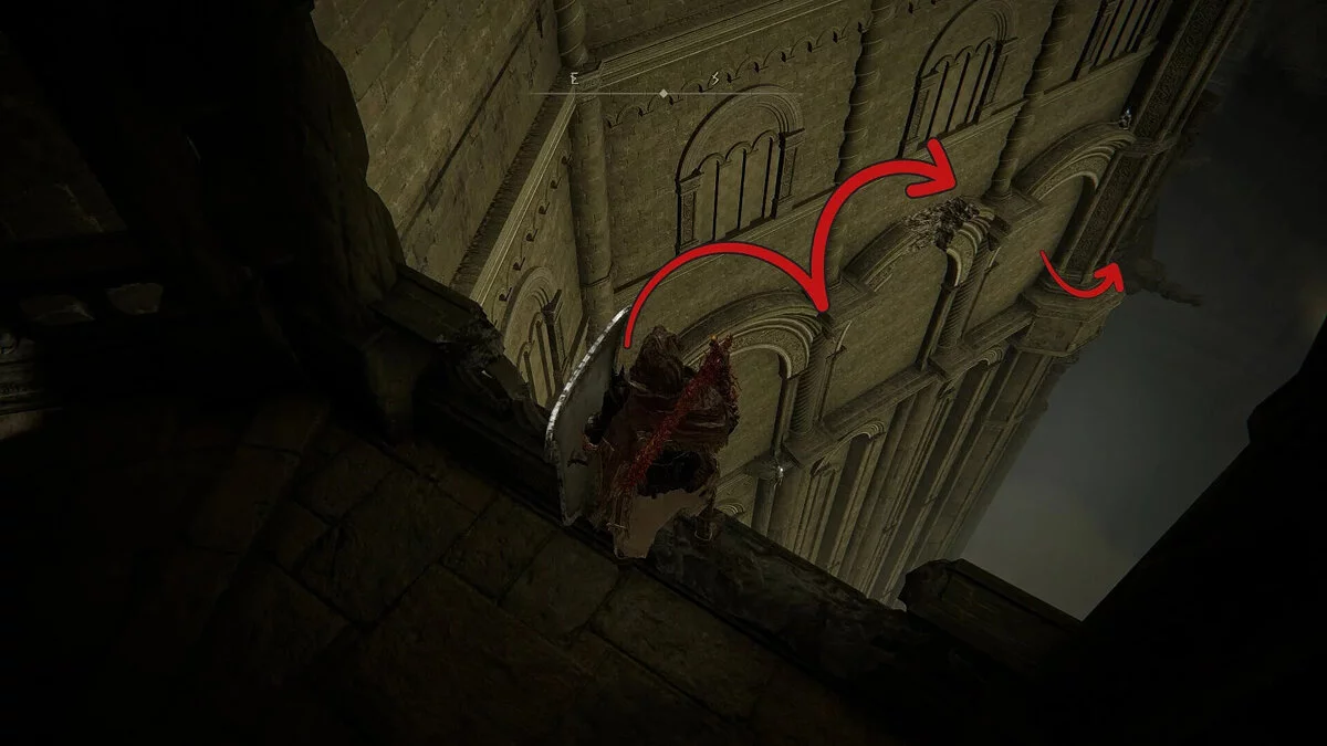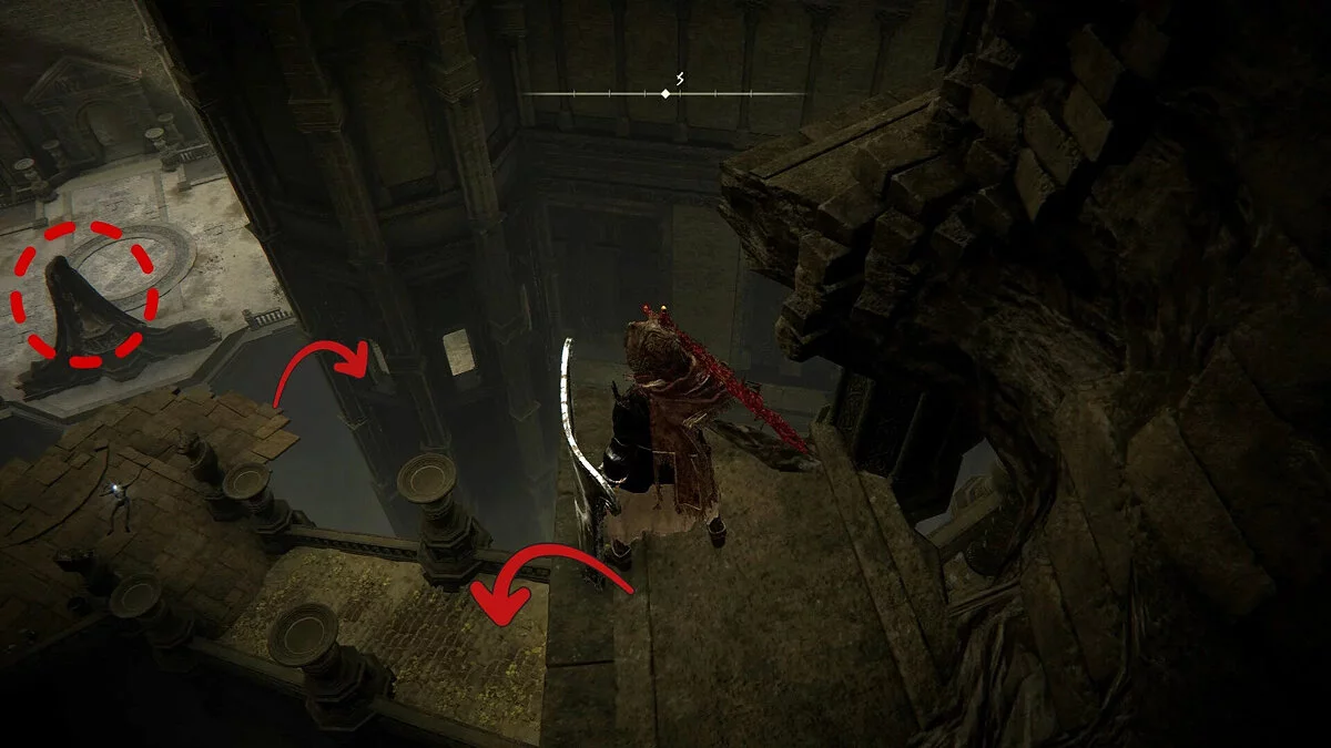 Посмотрите внимательно внизу, и вы сможете заметить несколько арок, выступающих из здания, и несколько трупов с блестящими предметами, которые помогут вам. Прыгните к стене, чтобы благополучно приземлиться на выступе, и идите по аркам на юг.