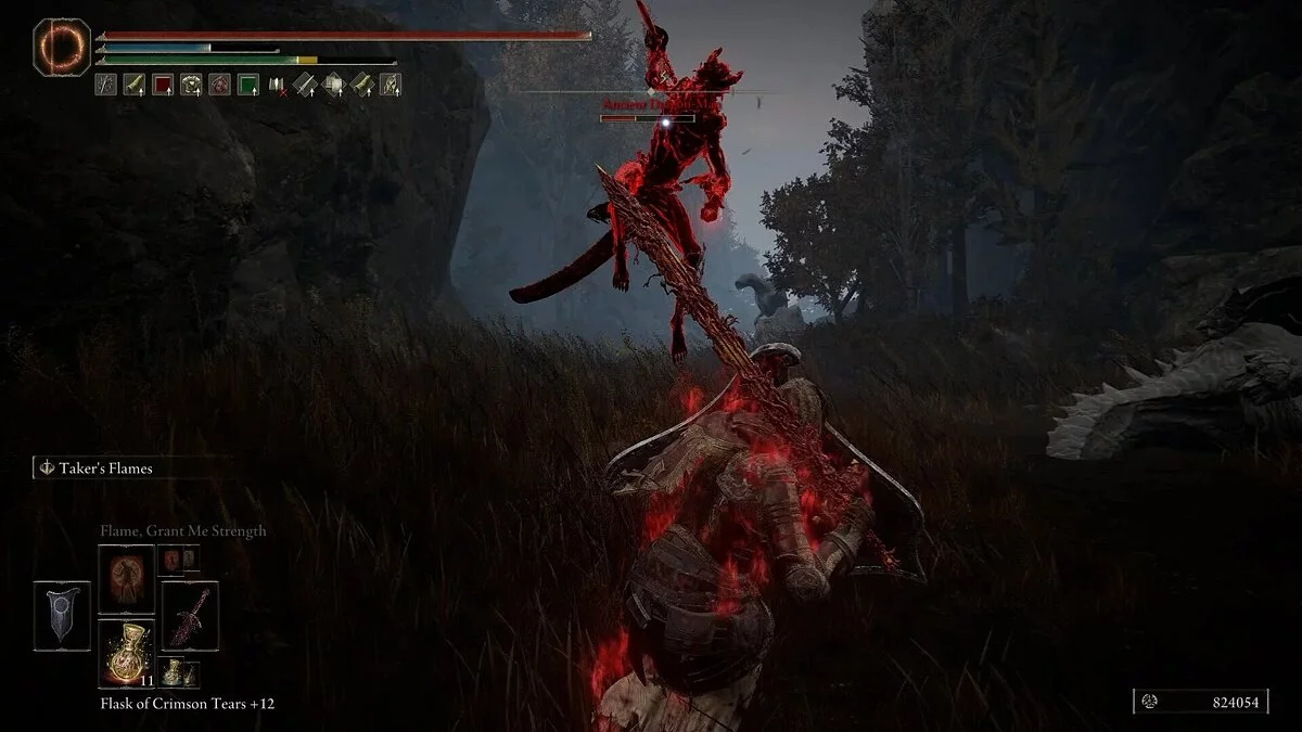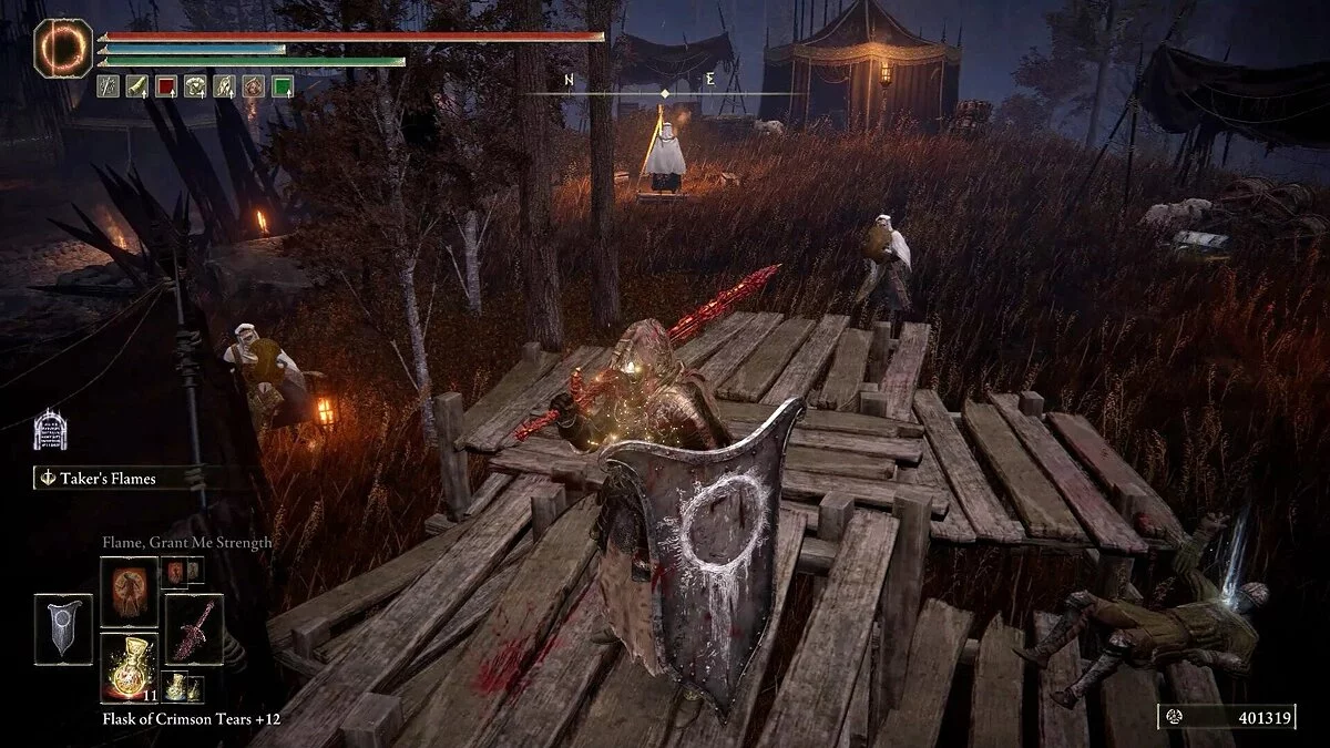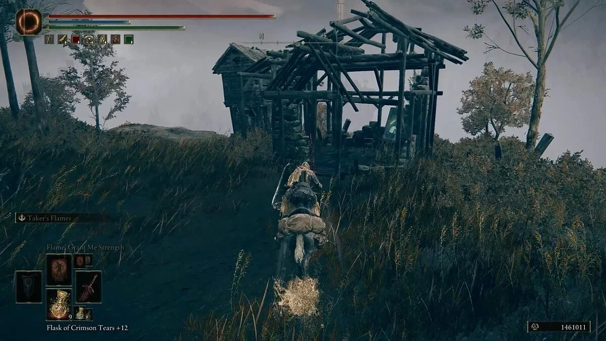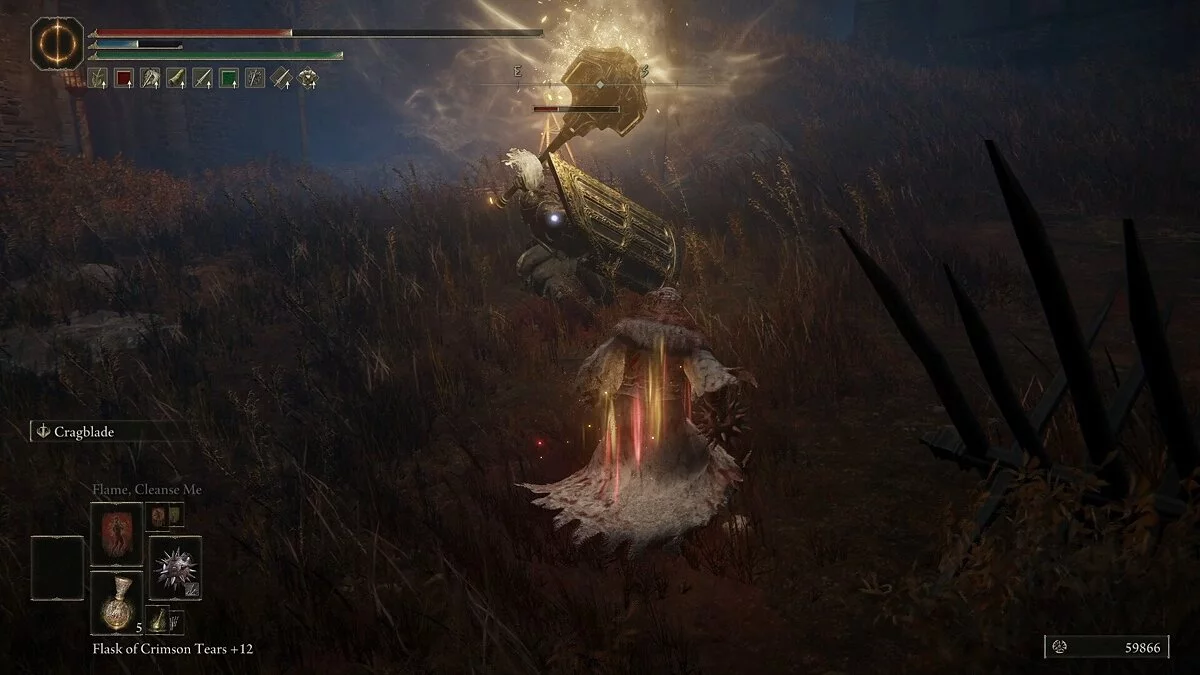 Убив рыцаря, вы получите Эмблему Священного похода, которая повышает силу атаки после победы над врагом. Она даст хорошую прибавку к урону после убийства мелких теневых противников. Обыщите область и соберите предметы: растения (Dewgem), Черных огнянок и Пепел войны — Крик скорби. В левом углу можно собрать камни и стрелы.