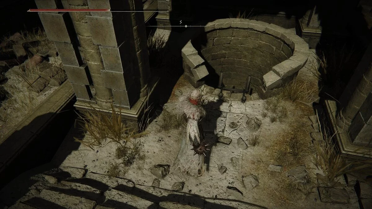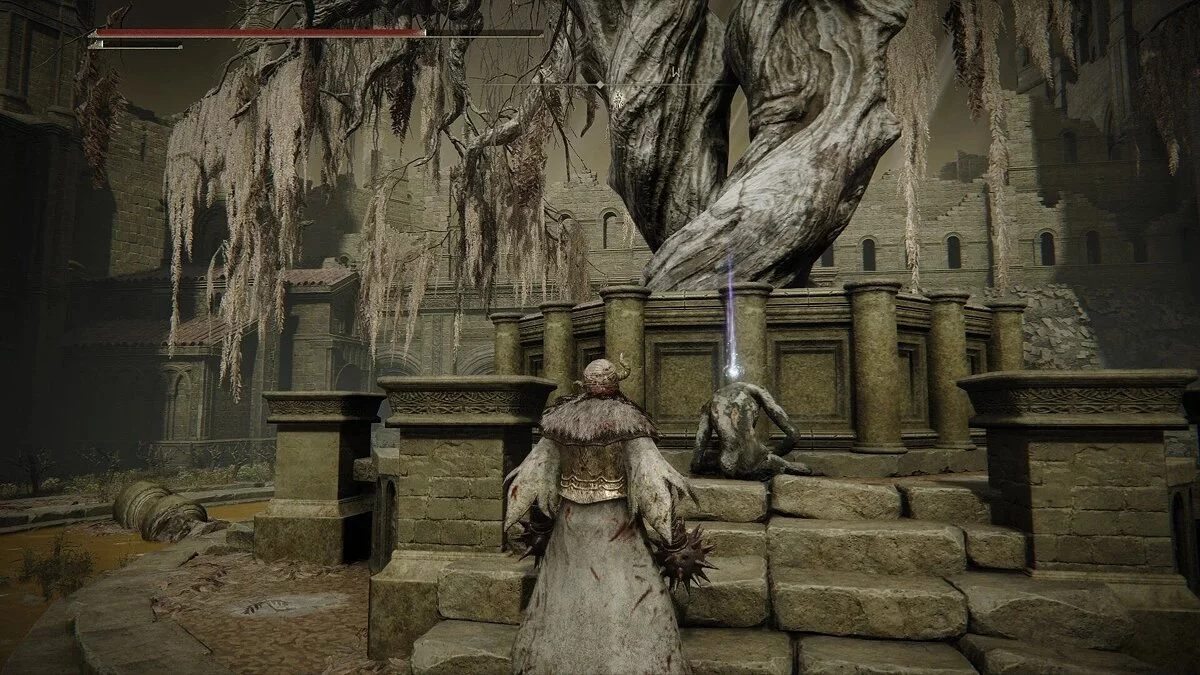 Поднимитесь по лестнице, чтобы активировать место благодати, но не отдыхайте, так как мы не еще обыскали всю локацию. Пройдите через дверь и сверните налево. Справа будет опасный враг, поэтому не стоит к нему приближаться. Далее вы найдете заклинателей, которые мешали вам в самом начале. Убейте их. В конце моста будет запертая дверь. Вернемся к ней позже.