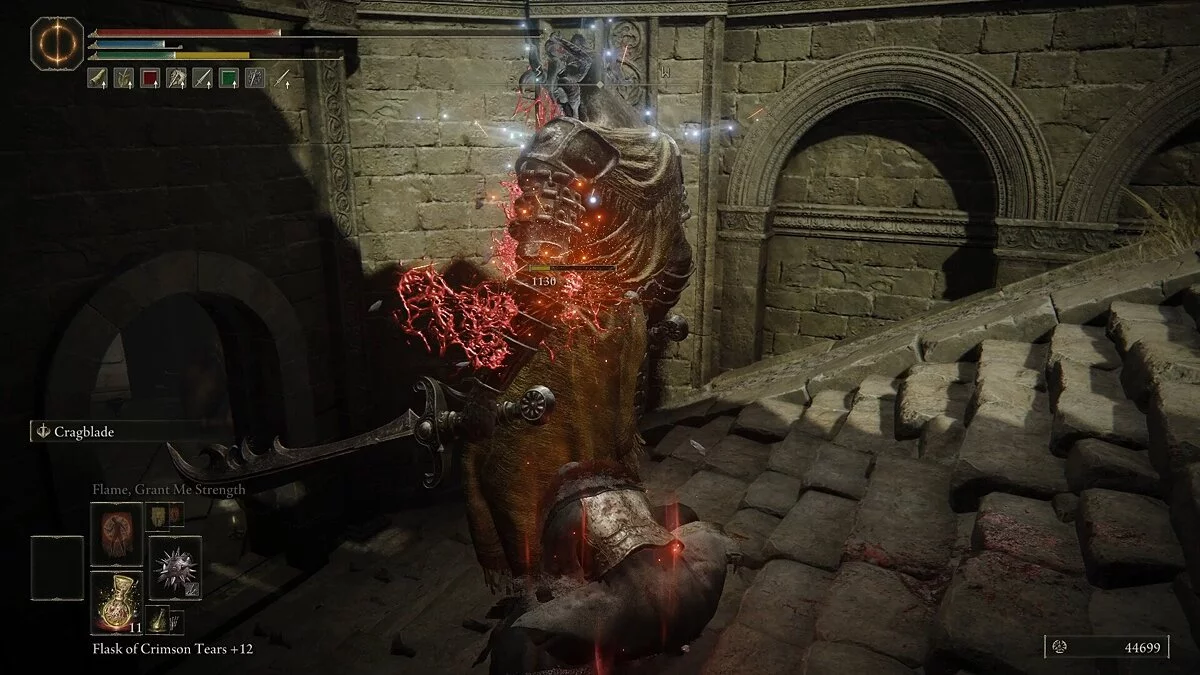 Когда булава рыцаря засветится, его атака будет сопровождаться магической атакой по земле. Лучший вариант — просто держаться позади и ждать, пока он проведет все удары булавой. Далее проведите атаку на бегу или комбинацию, пока щит рыцаря будет опущен. Старайтесь быстро отступать, прежде чем он успеет нанести удар щитом. Когда рыцарь будет мертв, обязательно посетите левую от тропы башню. Внутри вы найдете кулинарную книгу Верного рыцаря.