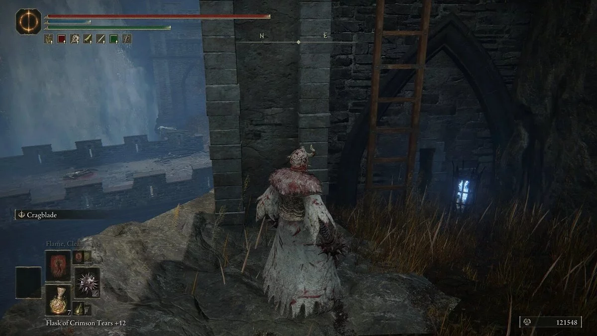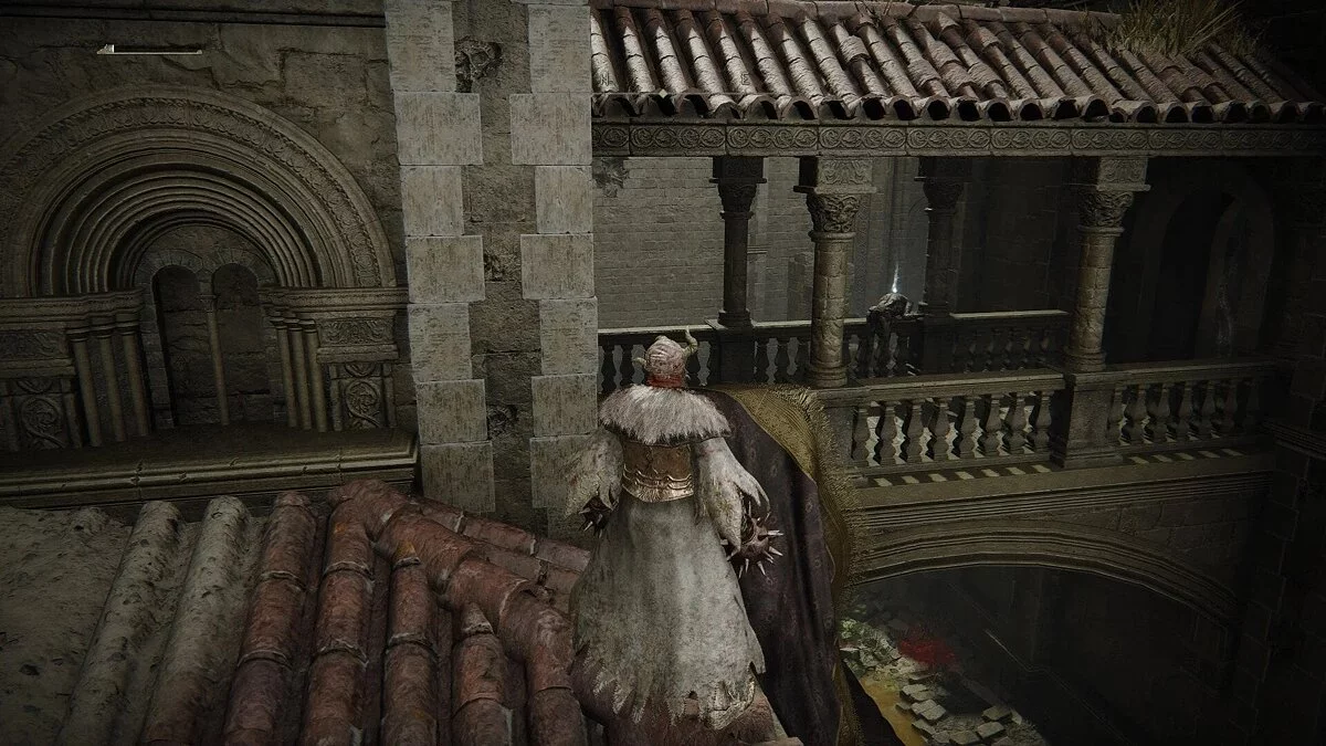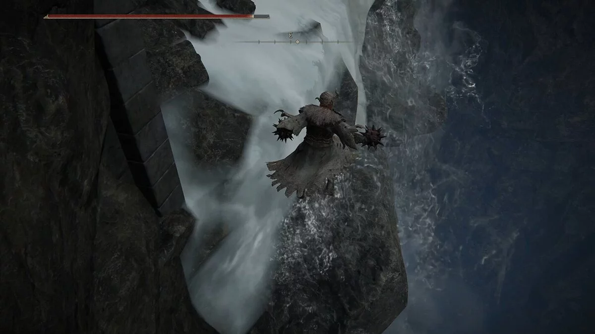 Зайдите в комнату справа. Вы встретите колдуна, с которыми ранее сражались в Райя Лукарии. Он не представит особой угрозы. Просто бейте по его щиту, пока не сломаете стойку. Затем добейте его, пока он в беззащитном состоянии. Перед выходом возьмите Руну Теневого Царства (4). Затем идите налево от того места, где вы сражались с рыцарем, и поднимитесь по лестнице. Идите по этому пути наверх, и вы окажетесь на скале с видом на водопад. Посмотрите налево, и вы увидите лестницу, которая поможет вам забраться на стену замка.