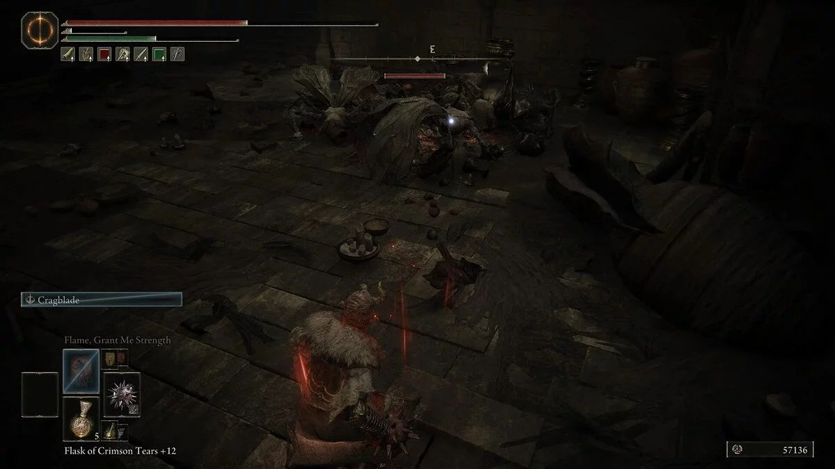 Пройдите в левую дверь, чтобы попасть в большую комнату. Она заполнена маленькими воинами-кувшинами, которые будут отчаянно пытаться схватить вас. К счастью, у них мало здоровья, и они, скорее всего, погибнут от одной заряженной атаки. Слева будет стоять алтарь, а нам будет стоят особый Осужденный, который призывает трясину крови. Эта субстанция будет замедлять вас и наносить урон. Постарайтесь кувырками добраться до врага раньше, чем начнет кастовать магию. Убив врага, вы сможете забрать Ирис Милости, а также подобрать Большой треснувший горшок с кровати. Ирис — важный предмет, который позже можно отдать некоторым ключевым персонажам. Пройдите на другую сторону зала и оттуда в смежную комнату. Победите Осужденных и спуститесь по лестнице. Вас встретят воины-кувшины. Убив их, активируйте место благодати.