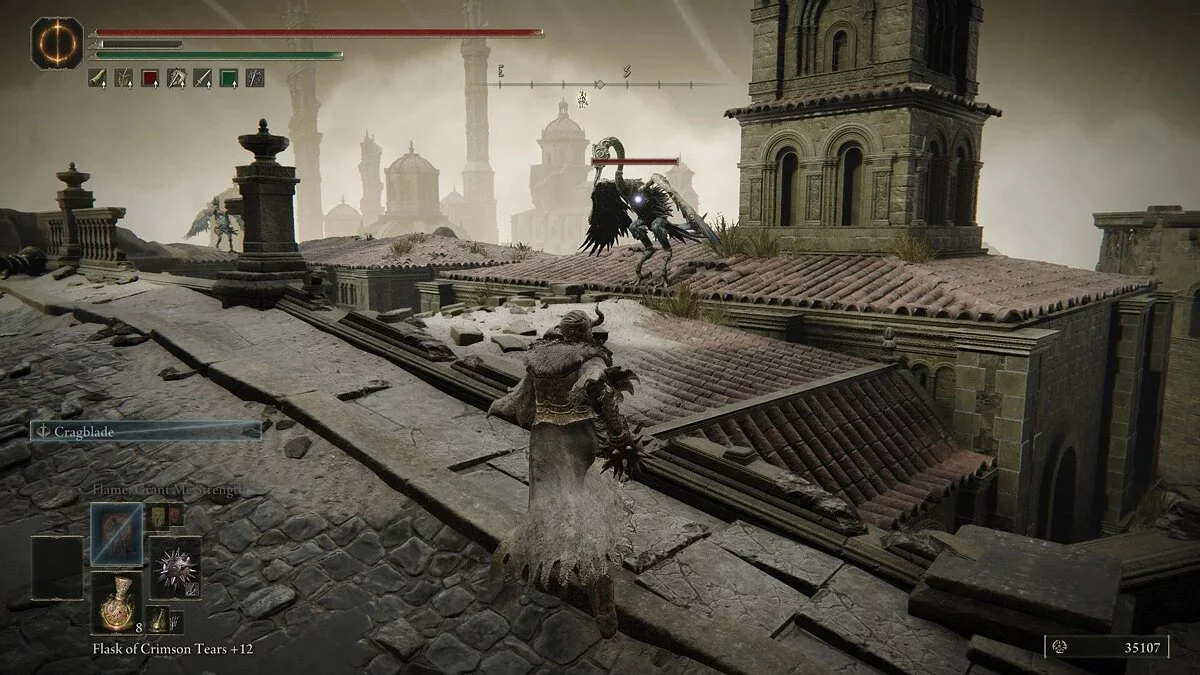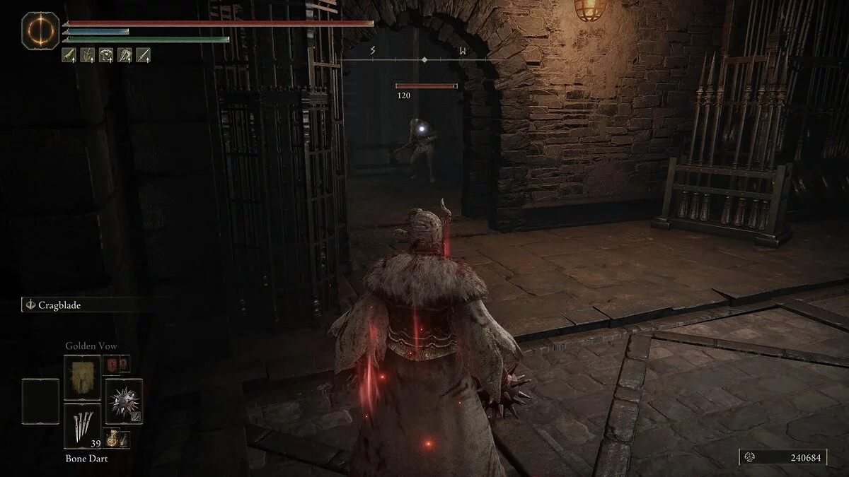 Вы столкнетесь с врагом, который владеет рапирой и арбалетом. Он довольно ловкий и хорошо уклоняется от атак. Загоните его в угол и нанесите комбо-удар. Как только он умрет, вы можете забрать Мрачный кузнечный камень с вершины стены. Спуститесь на землю и вернитесь к первой лестнице. Поднимитесь наверх. Здесь вы столкнетесь с карианским рыцарем. Он владеет двуручным мечом, но не пользуется щитом. Враг может призывать блестящие клинки, которые обеспечивают небольшую защиту. Его атаки наносят огромный урон, но они очень медлительные.