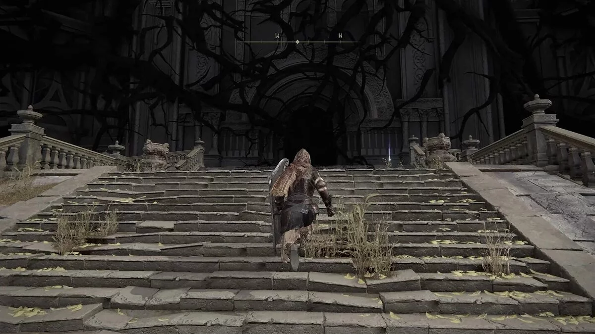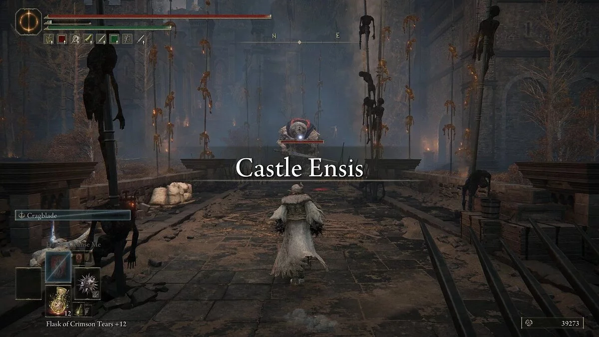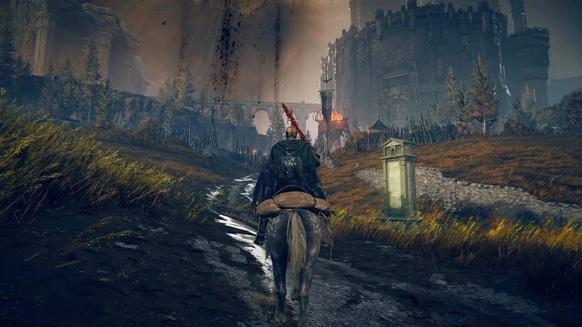 Оказавшись на другой стороне, вы можете свободно пройти к воротам замка. Не забудьте захватить фрагмент Благословения Древа возле статуи справа, а также активировать место благодати рядом с дорогой — Замковый фасад. Победив рыцаря-тролля у подножия, вы попадете в сам замок Энсис.
