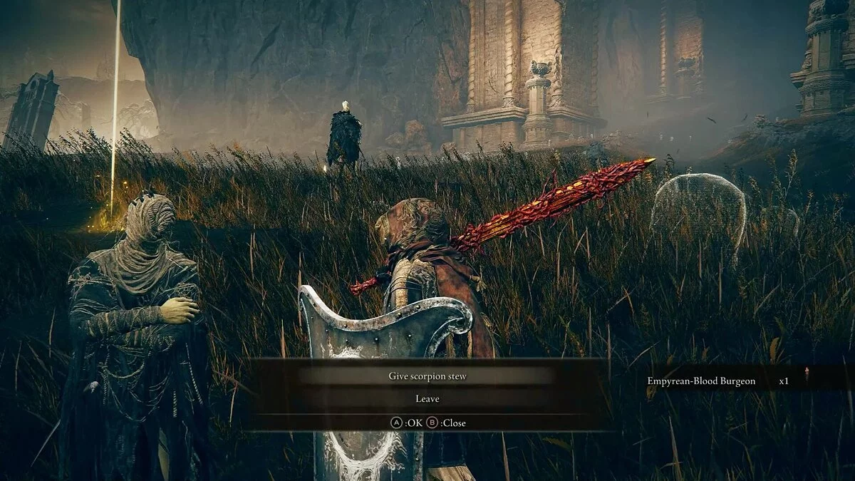 Через арку вы увидите небольшую дорогу, которая ведет к стеле и фрагменту карты. Она стоит рядом Выжженными руинами (Scorched Ruins), которые нужно исследовать, чтобы собрать новые мощные предметы: Огромный треснутый горшок, Кулинарную книгу Великого Владыки (1) (дает возможность изготавливать Огромные треснутые горшки) и Талисман Клинка Милосердия (увеличивает урон после критической атаки).