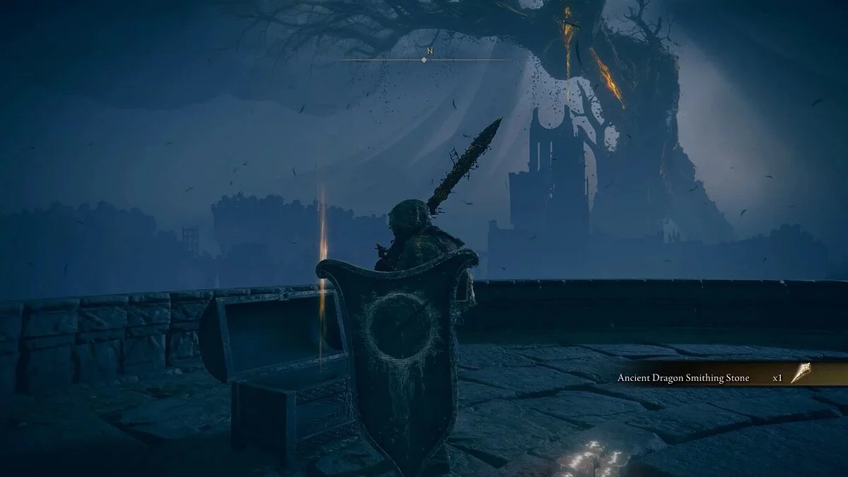Продолжайте идти вперед. Далее по лестнице вокруг башни. В засаде будет сидеть рыцарь-копейщик. Будьте готовы уклоняться и блокировать его атаки. Внутри башни вы найдете сундук с Ключом Зачарованного Меча. Выходите из комнаты и посмотрите вперед. Вы увидите огромного рыцаря с булавой. Убейте его по уже известной тактике. Если вы не хотите с ним сражаться, просто пробегите мимо и воспользуйтесь лифтом. Наверху будет комната с местом благодати. Выше будет обасть с боссом. Но прежде нам нужно изучить еще одно место. На балконе вы найдете Мрачный кузнечный камень. Спрыгивайте вниз, чтобы попасть на скалу. Аккуратно двигайтесь дальше, чтобы добраться до башни. Входи внутрь. Поднимитесь по лестнице, чтобы попасть на вершину. Вы найдете сундук с пеплом войны. Его можно применить к легким двуручным мечам. Возвращайтесь в Зал Лорда, чтобы приготовиться к битве с боссом.