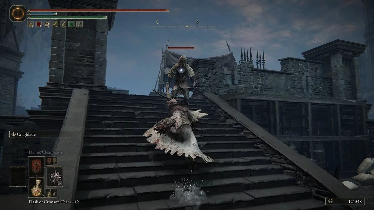 Прежде чем начать исследование региона Скаду Альтус, нам нужно собрать оставшиеся предметы в замке. Скачите на запад, в сторону двух рек, которые образуют водопады. Уклонитесь от атак бродячего рыцаря-тролля и перейдите реку. Спрыгните вниз, чтобы оказаться над контрольно-пропускным пунктом замка. Теперь вы можете добраться до ворот крепости. Заберите из небольшой башни два осколка рун. На валу проверьте южную сторону пропускного пункта, чтобы найти сундуку с магическим мечом. Перепрыгните через несколько платформ, чтобы добраться до южного вала. Заберите осколки звездного света.