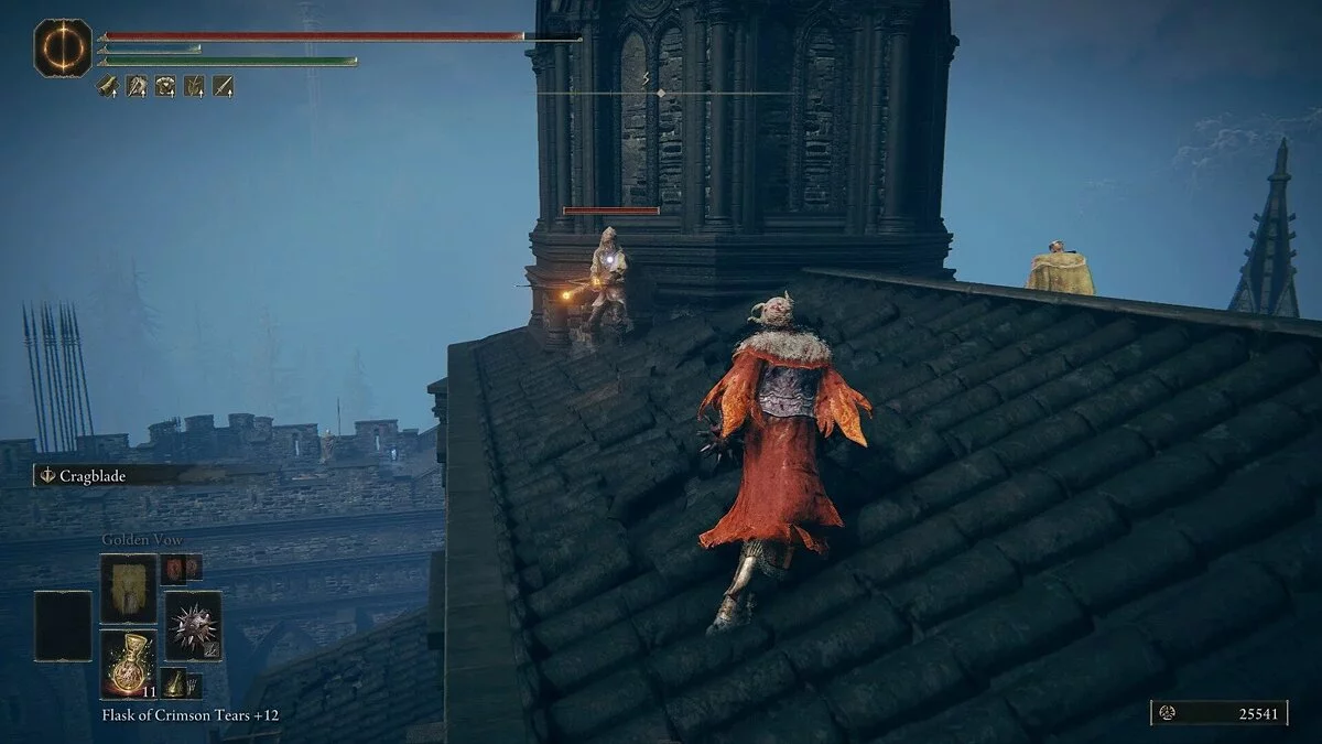 Пройдите мимо площади и поднимитесь по лестнице в башню. Идите направо и возьмите камень с уступа. Затем идите налево от двери и поднимитесь по лестнице. Здесь вы столкнетесь с очень агрессивным врагом — Проклятым клинком. Место благодати находится за этим противником, так что вы можете пробежать мимо и активировать его. После этого вернитесь к врагу и убейте его. Стоит отметить, что проклятый постоянно вращается и не перестает атаковать. Сохраняйте дистанцию и переждите одну из мощных атак, чтобы получить окно для выпада.