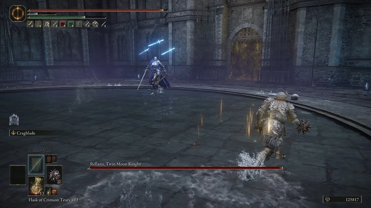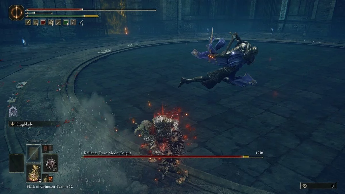 Реллана, Рыцарь Двойной Луны — сильный боец, который пользуется комбинацией из быстрых ударов двойным мечом и магических заклинаний. У босса очень большой радиус атаки, и ее очень сложно избегать. Важнее запомнить ее действия и не пытаться перекатываться. Основная загвоздка заключается в том, что ее комбо часто вводят в заблуждение. Она может закончить их слишком рано или, наоборот, продлить, в зависимости от ситуации. Используйте уклончивую стратегию, маневрируя в пределах радиуса ее атак и выходя за их пределы.