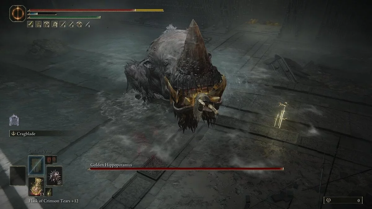 Бегемот почти всегда начинает битву, бросаясь на вас с открытым ртом. Эта приводит к захвату, в ходе которого враг кусает вас несколько раз, нанося большой урон. Сам укус довольно медленный, но имеет большой радиус действия. Босс запросто поймает вас, даже если вы прокатитесь мимо. Старайтесь обходить его и атаковать сбоку, когда рывок подходит к концу. Главное — не жадничайте. После одного сильного удара отступайте.