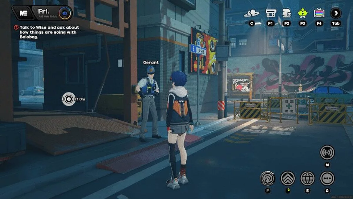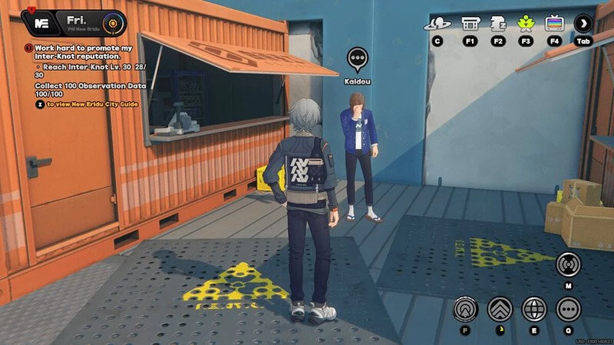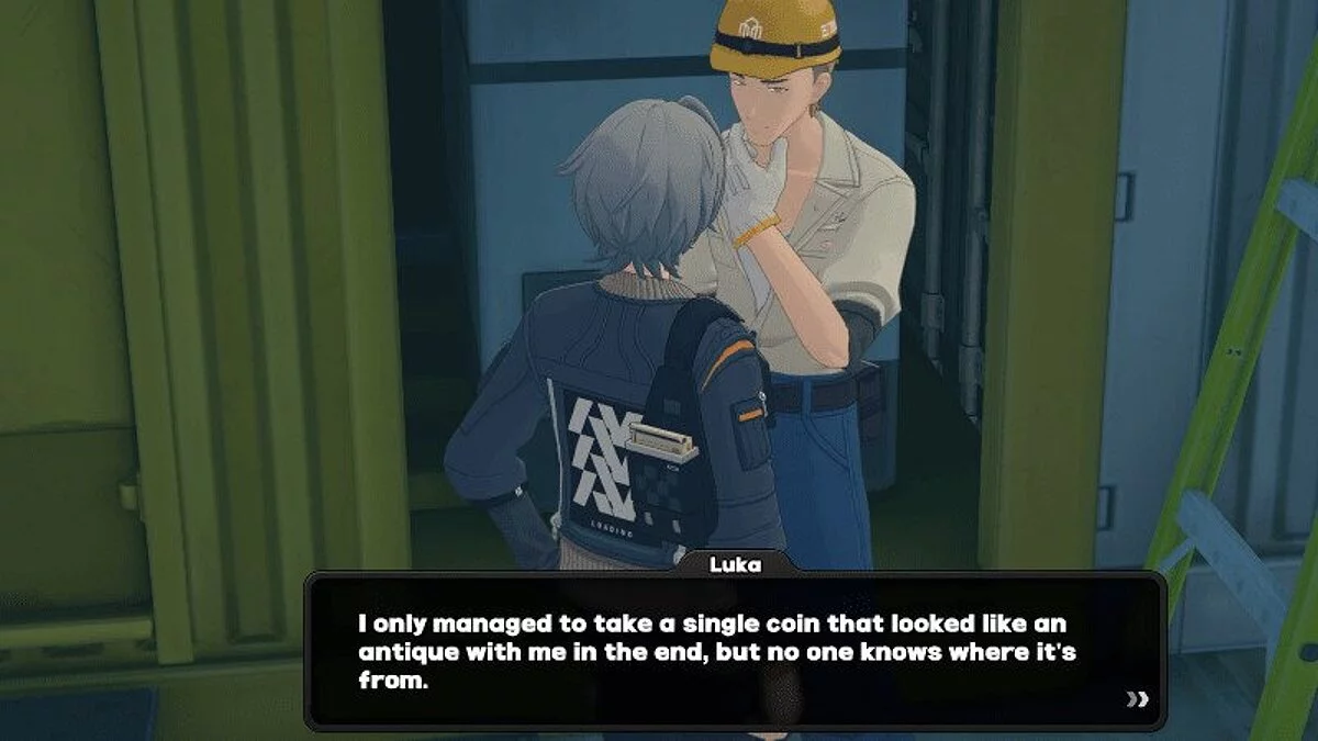 Вечер. Поговорите с Джен, которая стоит у башни из ящиков. Пообщайтесь с Кайсю. Она стоит у синего контейнера.