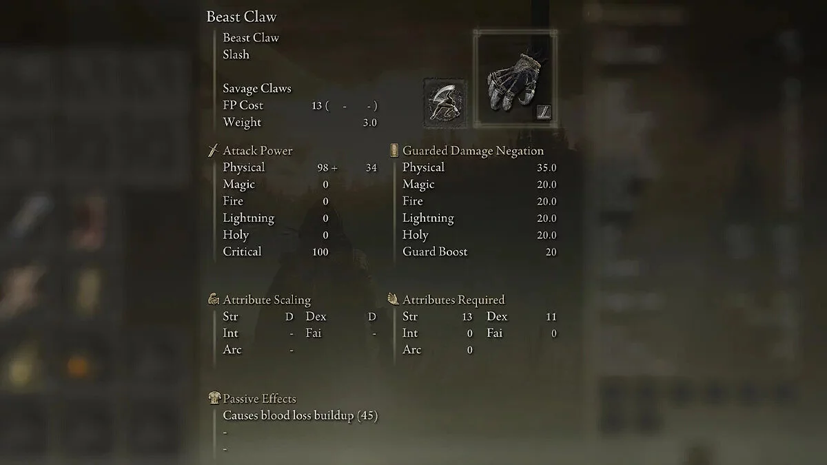 «Коготь зверя» представляет собой новый тип оружия, который наносит больше урона, чем большинство обычных когтей в Elden Ring. Когда вы надеваете их, вы будете приседать низко к земле, чтобы использовать навык «Дикие когти», который позволяет вам наброситься, как зверь, и нанести удар по противнику левыми и правыми когтями.