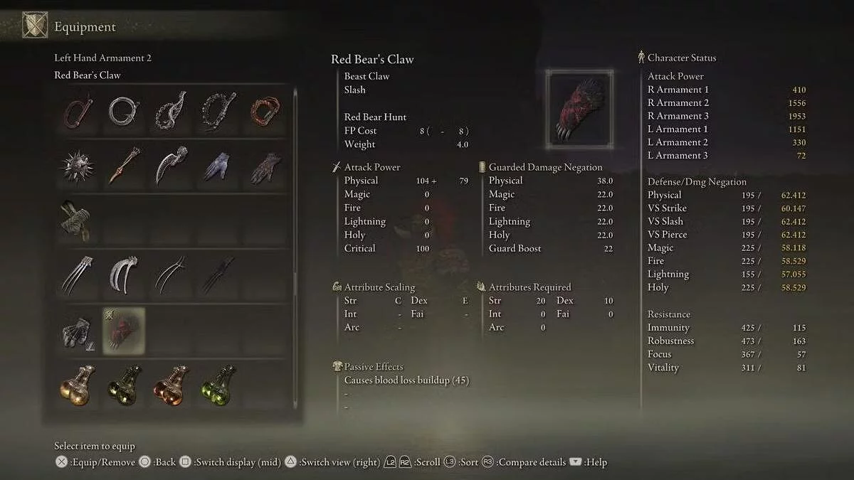 «Коготь красного медведя» — это, по сути, улучшенная версия оружия «Коготь зверя». Это отличный вариант для тех, кто заинтересован в построении билда с кровотечением, основанным на силе. Когти быстро принесут врагам кровопотерю при успешном выполнении комбо.