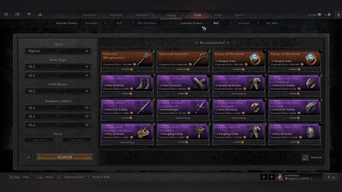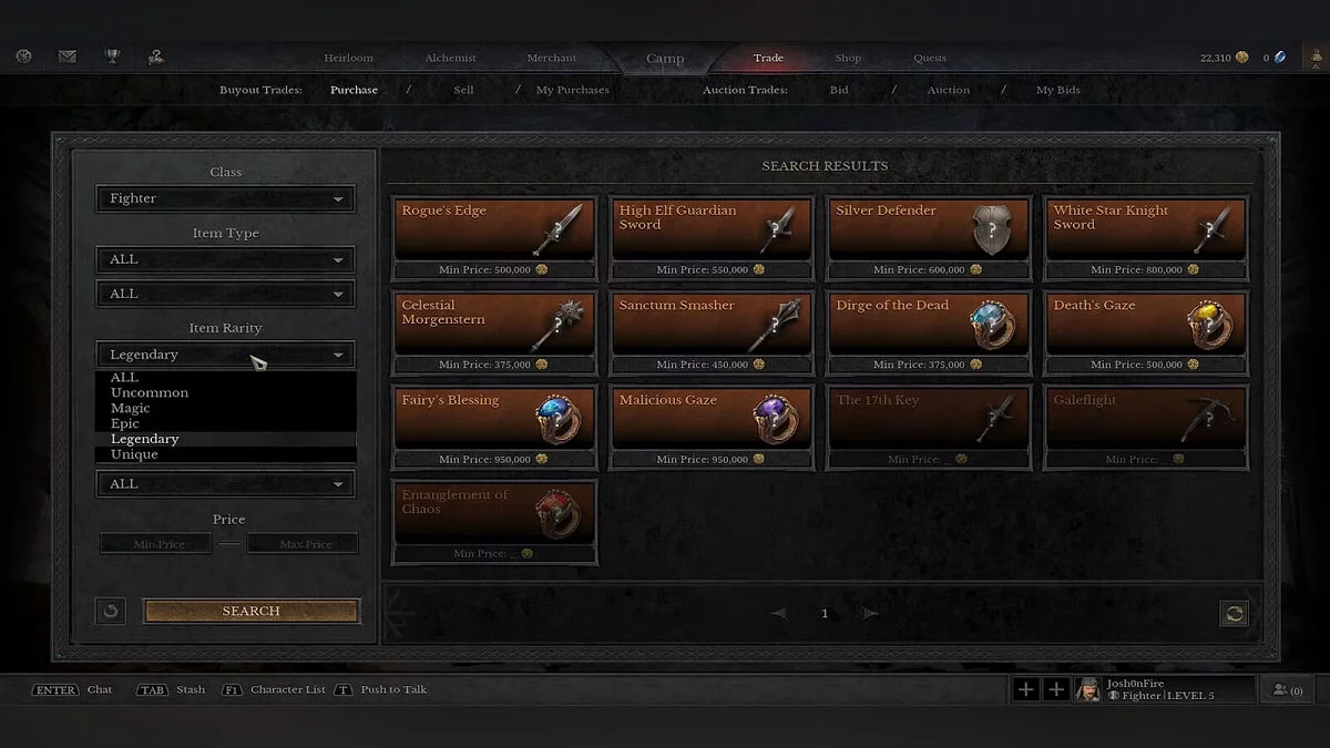 Находясь в меню лагеря осмотрите правую его часть и отыщите кнопку «Аукцион», чтобы открыть соответствующий раздел. Первое меню здесь — рекомендуемые предметы, выставленные на продажу другими игроками. Все вещи можно отфильтровать при помощи меню в левой части экрана: по типу, редкости, цене, классу и другим параметрам. Всего существует пять типов редкости: