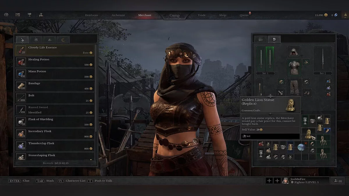 Продать любую вещь в Dungeonborne довольно просто: после возвращения в свой лагерь вам нужно посетить торговца (кнопка находится в левом верхнем углу экрана). Вы окажетесь в меню магазина, где сможете избавиться от хлама или продать ценности — достаточно кликнуть ПКМ по вещи, чтобы сделать это.