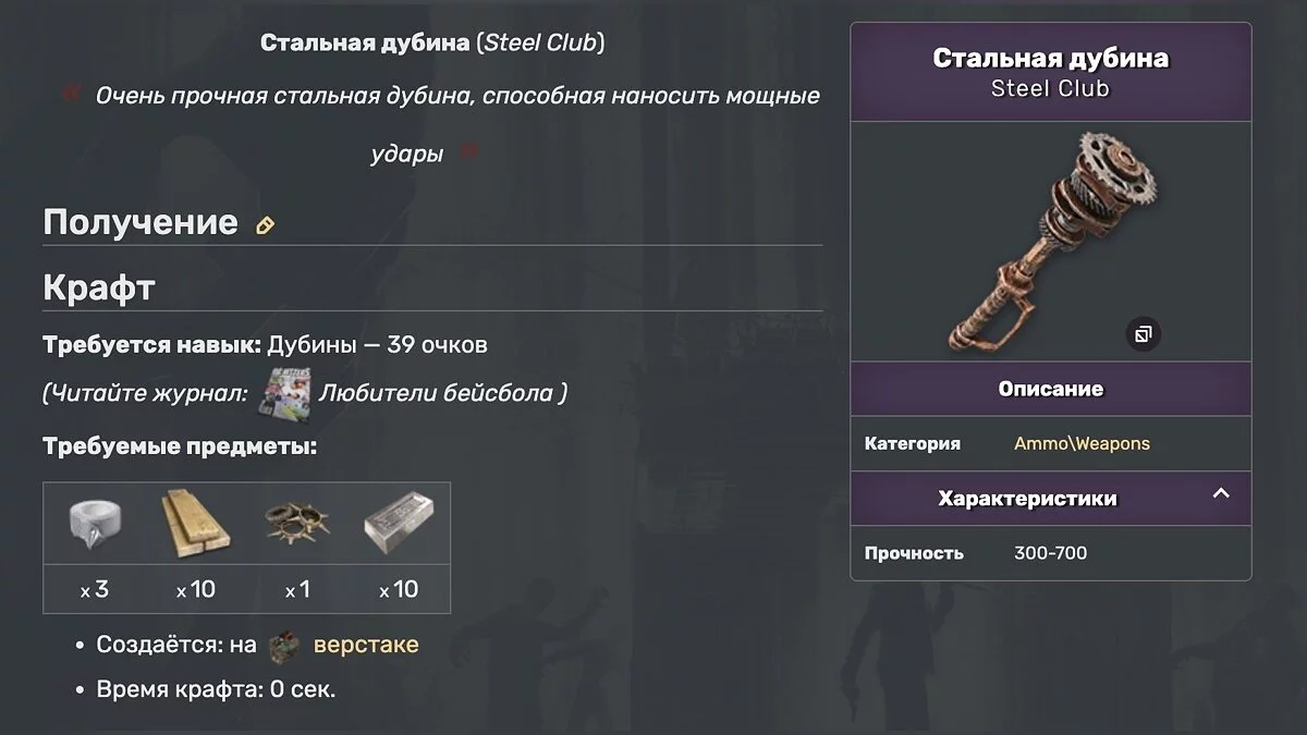 Рукопашное оружие для ближнего боя. В игре много и других предметов для «тесного контакта», однако дубина отличается от остальных инструментов тем, что способна с некоторым шансом нанести зомби критический удар. При попадании в голову вы можете мгновенно уничтожить врага. Кроме того, дубина тратит не очень много выносливости, а наносит значительный урон.