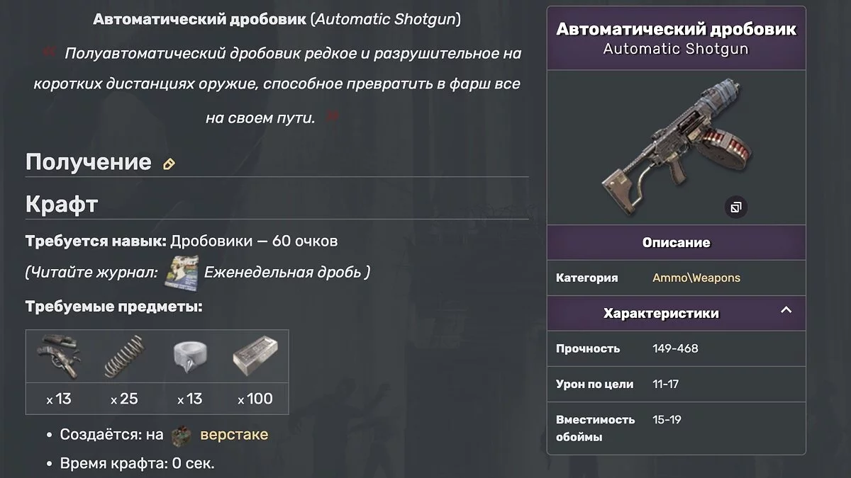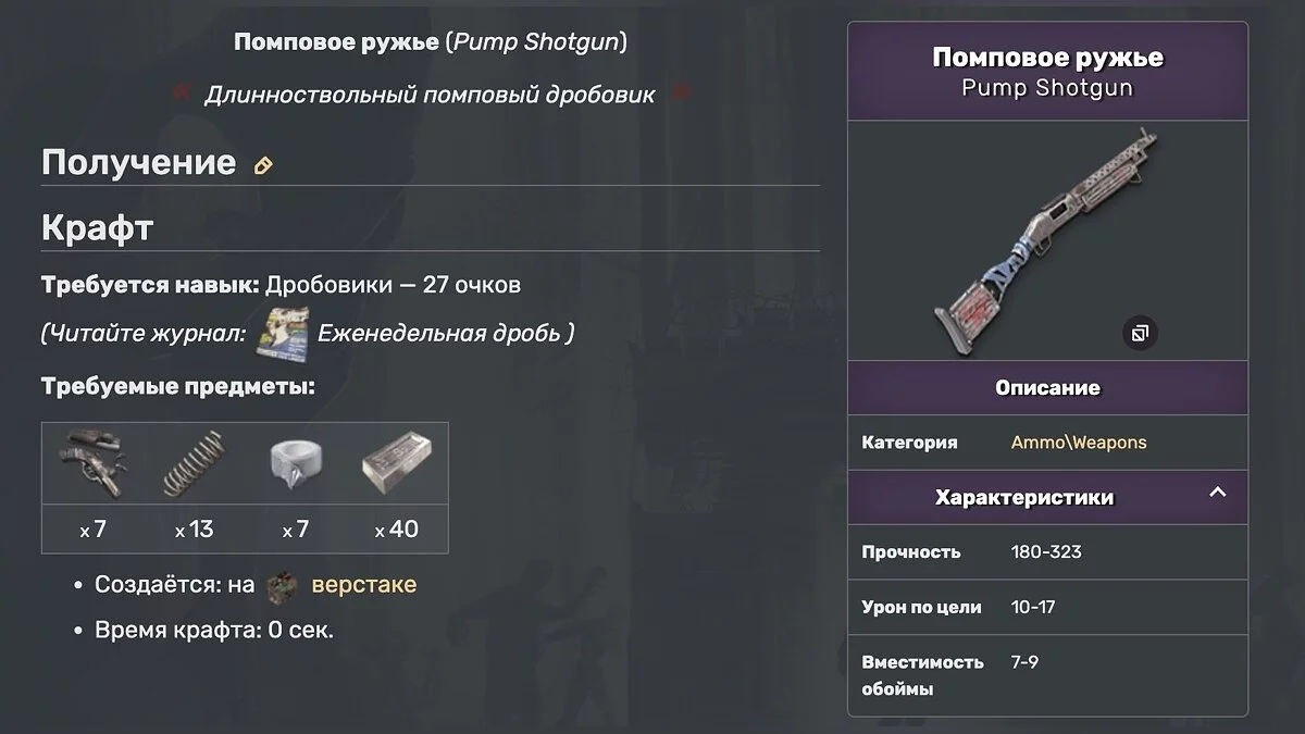 Ещё один дробовик в нашем списке, который подойдет для более поздних стадий игры. Во-первых, у него высокая пробивная сила и 16 патронов в магазине. Во-вторых, запас боеприпасов можно увеличить до 24, что существенно повышает эффективность. Более того, для дробовика доступен целый ряд апгрейдов. Например, получится поставить дульный тормоз, дополнительную рукоятку и удлиненный ствол. К тому же патроны вы легко найдёте или скрафтите по мере прохождения.