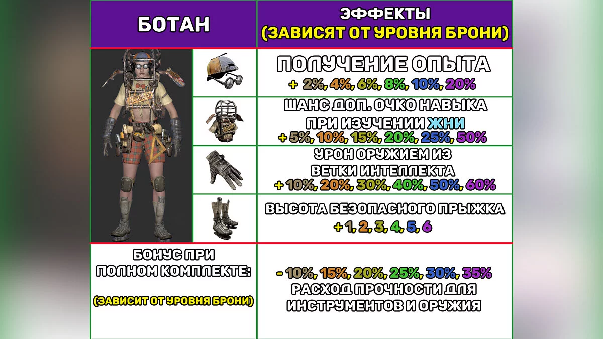 Броня «Прикид ботана» в 7 Days to Die даёт возможность получить два очка навыков изготовления при чтении журналов. Эта тяжёлая броня подходит для тех, кто предпочитает сосредоточиться на своих изобретениях и развитии навыков.
