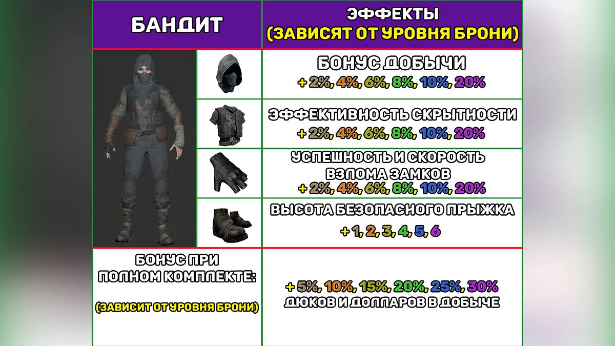 Наряд разбойника — это комплект лёгкой брони, который даёт бонусы к различной добыче и не накладывает штрафов на выносливость и скорость передвижения.