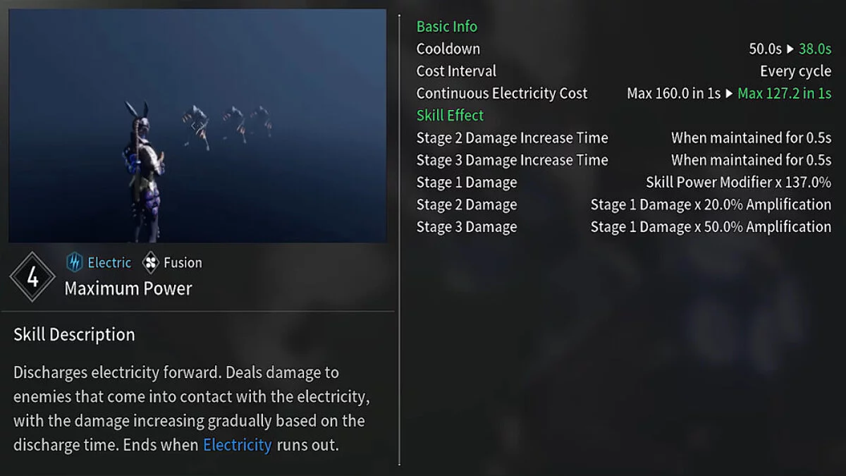 - Максимальная Мощность (Maximum Power) — Выпускает электричество вперед, нанося урон. Урон увеличивается пропорционально длительности навыка. Применение навыка закончится, когда будет использована вся накопленная электроэнергия.