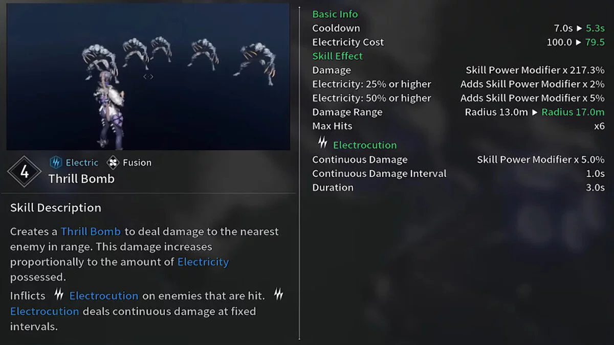 - Бомба Азарта (Thrill Bomb) — Вызывает электросферу, которая атакует ближайших врагов. Нанесенный ущерб пропорционален количеству накопленной электроэнергии. Эта атака вызывает поражение электрическим током врагов, находящихся в радиусе её действия. Эффект поражения электрическим током наносит непрерывный урон через определенные промежутки времени.