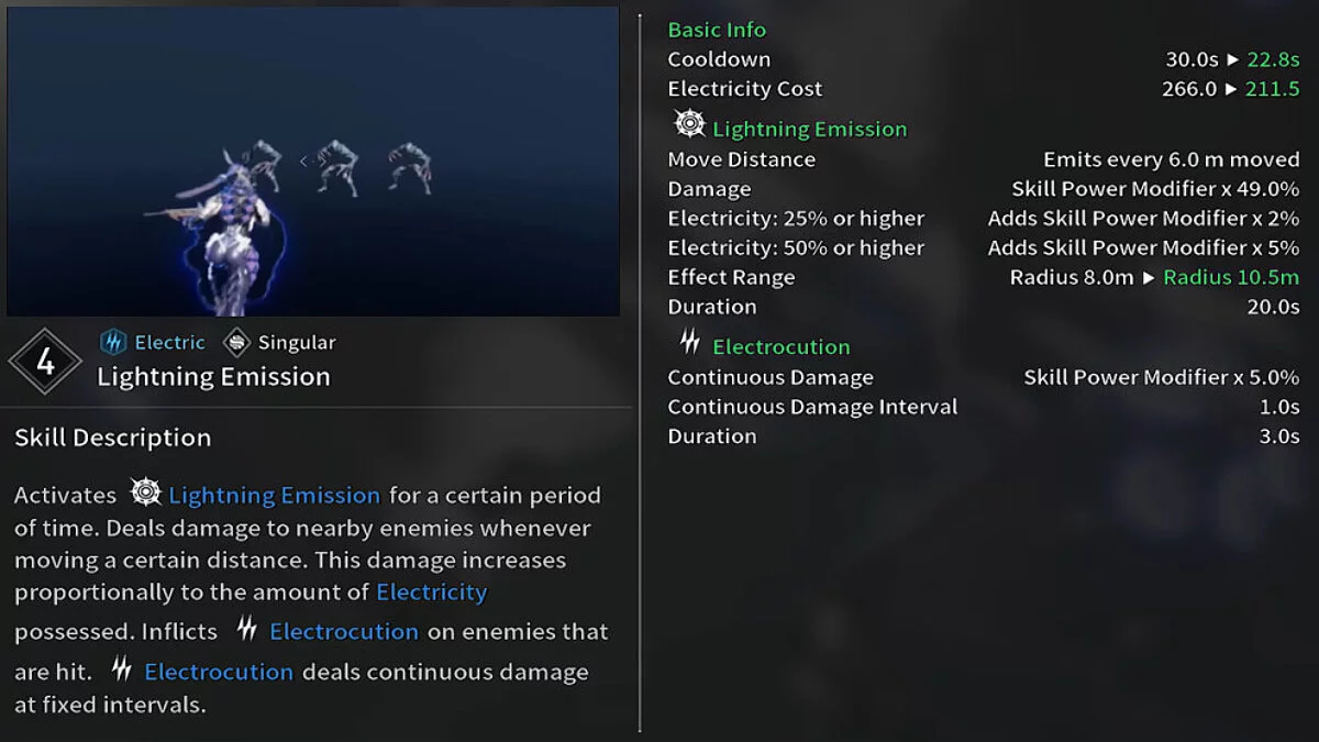 - Излучение Молнии (Lightning Emission) — При движении во время активации он наносит урон ближайшим врагам, пропорциональный количеству накопленного электричества. Это наносит врагам эффект поражения электрическим током.