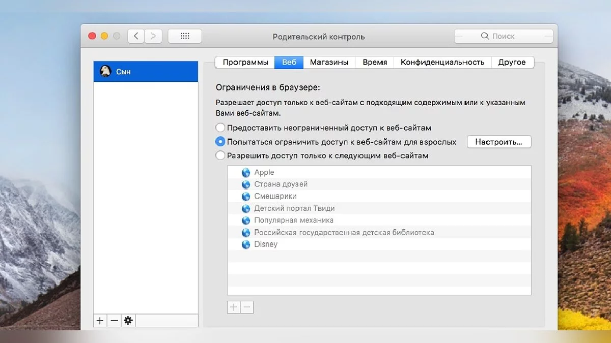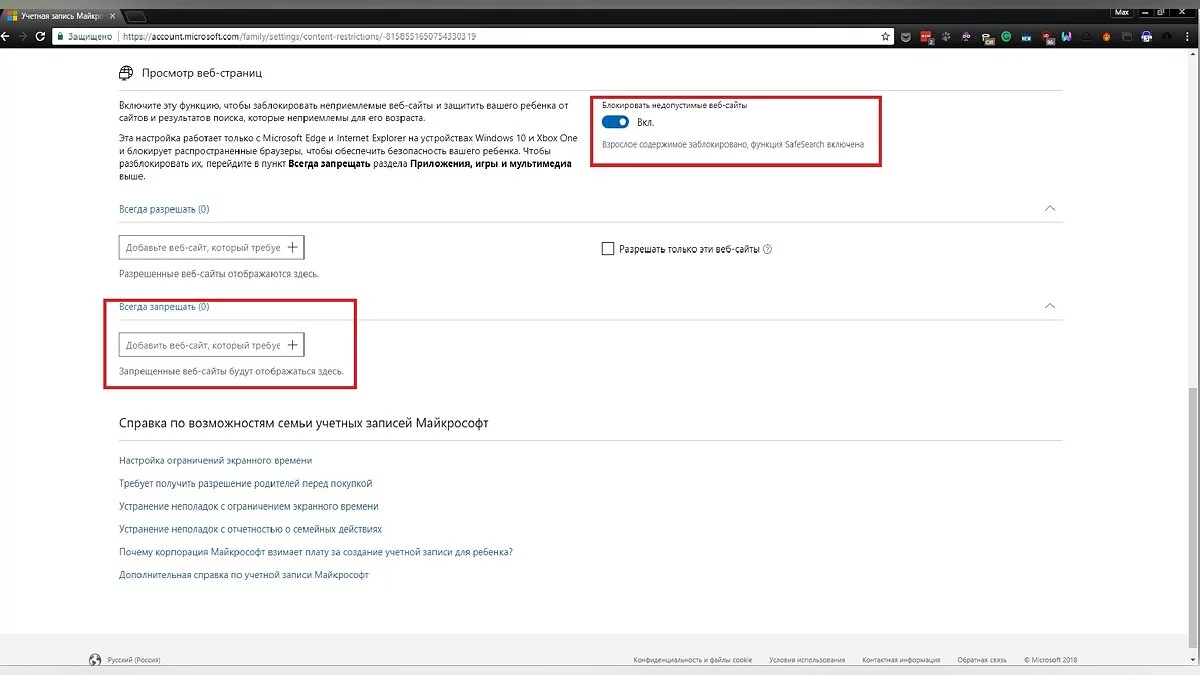 - Включите опцию «Ограничить доступ к веб-сайтам» и добавьте нежелательные страницы в список «Никогда не разрешать».