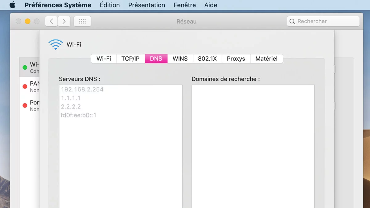 - На MacOS: в настройках сети выберите активное подключение и добавьте DNS-адреса на вкладке «DNS».