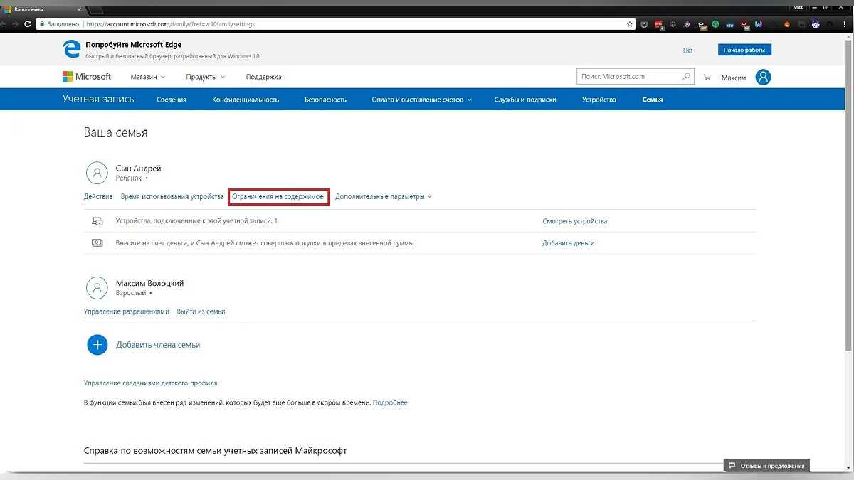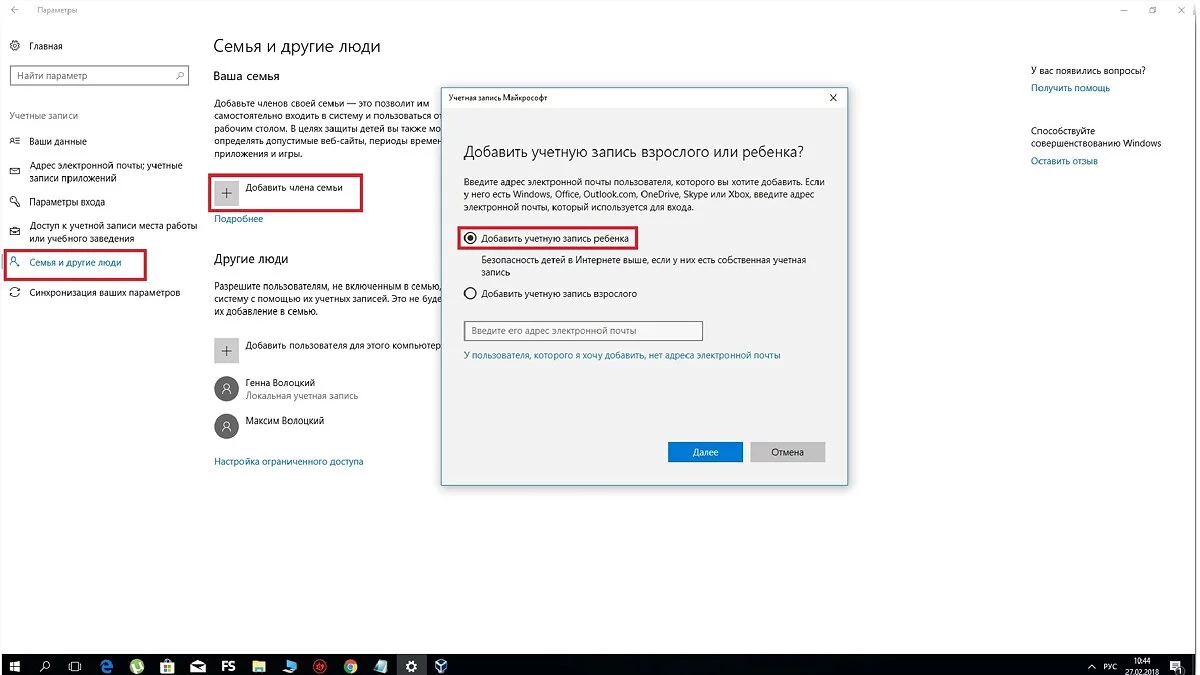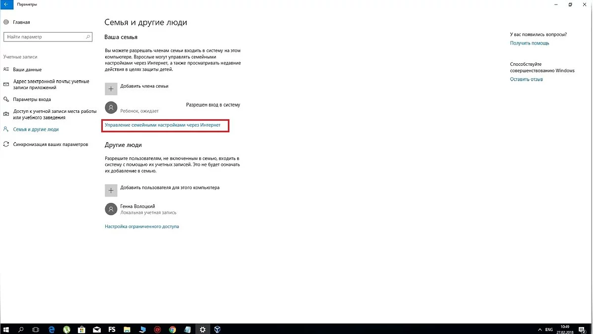 - Настройте учетную запись ребенка в разделе «Семья и другие пользователи».