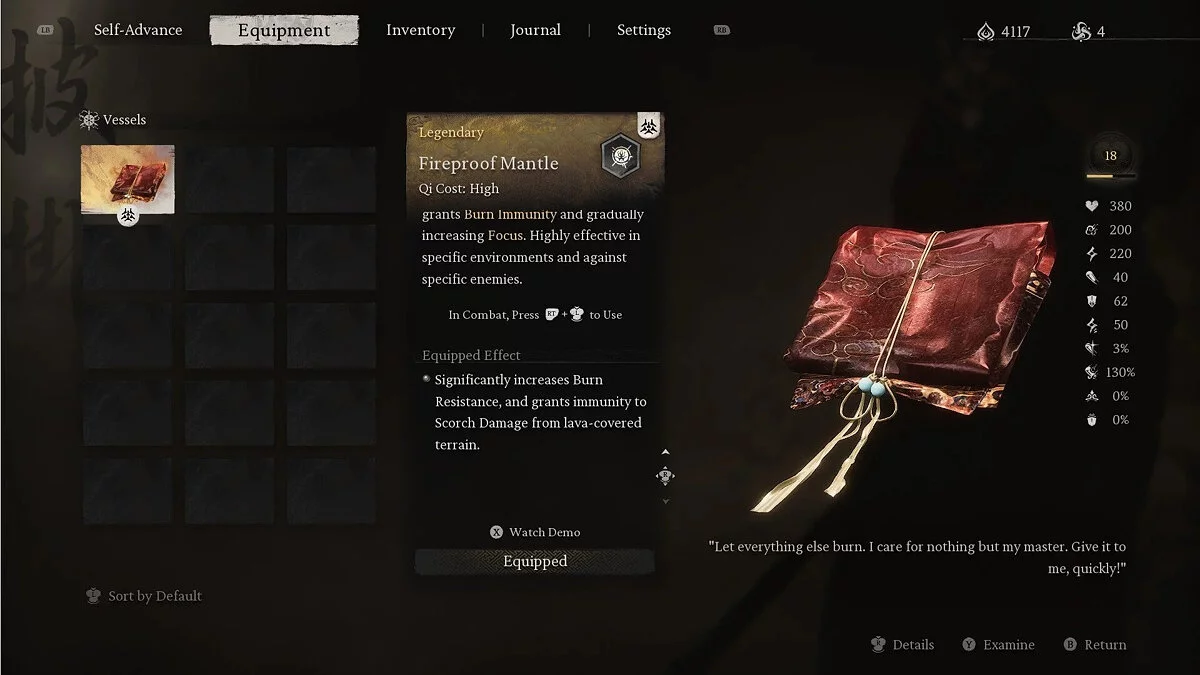 - После победы над «Старейшиной Джинчи» вы телепортируетесь обратно к третьему колоколу. Здесь взаимодействуйте с телом, которое висит перед третьим колоколом, чтобы получить Огнеупорную мантию.