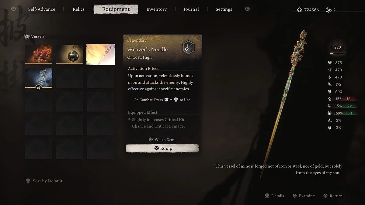 Когда вы разблокируете артефакт, вы сможете использовать его, нажав RT или R2 и левый стик. До этого вам придется выбрать артефакт в меню. Для этого откройте свой инвентарь, а затем проверьте слот рядом с духами и вашим снаряжением. Это ваш слот для артефакта. Когда он выбран, наращивайте свой ресурс Ци как обычно: либо отдыхая, либо сражаясь с врагами и накапливая его. Затем вы можете активировать артефакт.