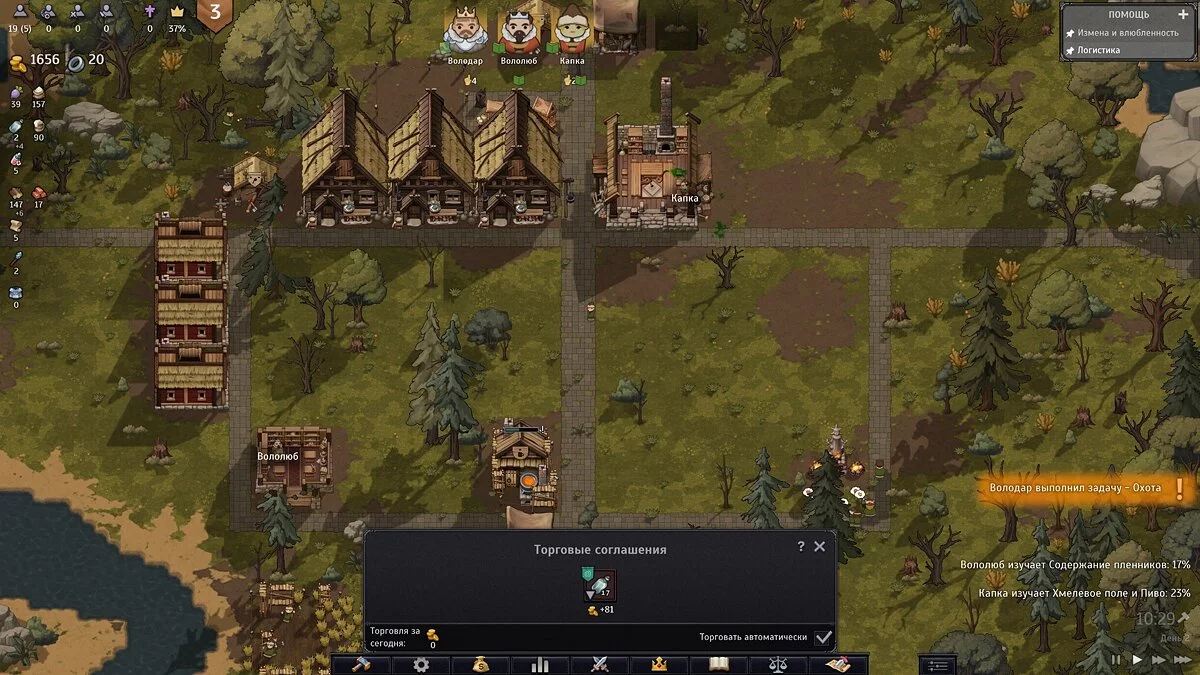 Как организуется симбиоз внешней политики и торговли? Допустим, ваш сосед справа продает древесину, а покупает муку. Сосед слева — продает хмель, а покупает тяжелые латы. А еще один сосед — продает рожь, а покупает душистый эль. Задача заключается в следующем: переработать хмель и рожь в пиво и муку, а используя внутренние ресурсы — произвести эль из хмеля и лечебной травы. Излишки древесины можно пустить на производство древесного угля, который затем комбинируется с плавленной рудой для создания тяжелых лат.