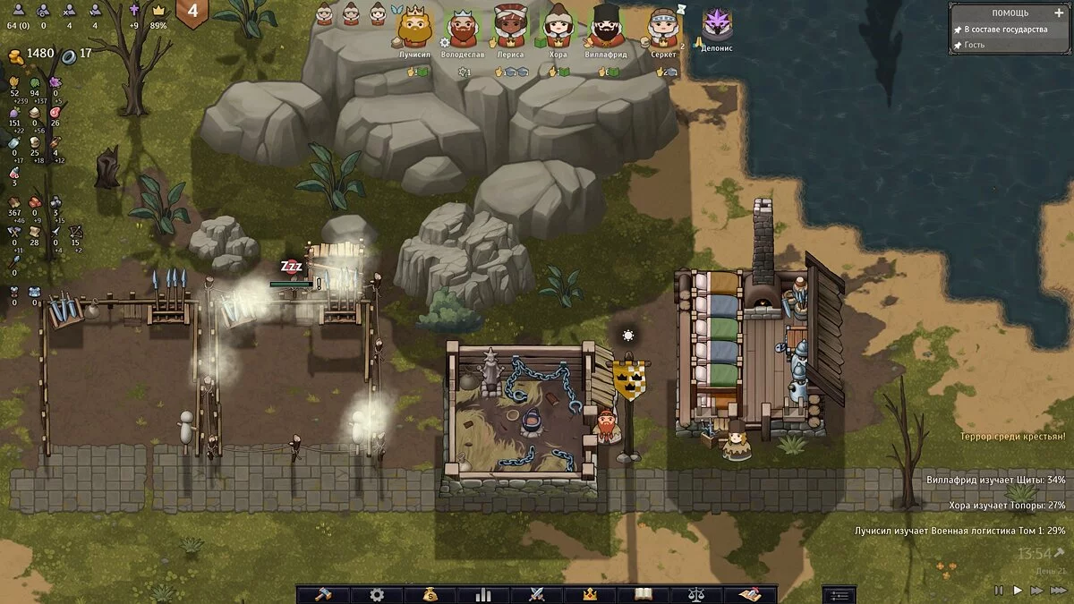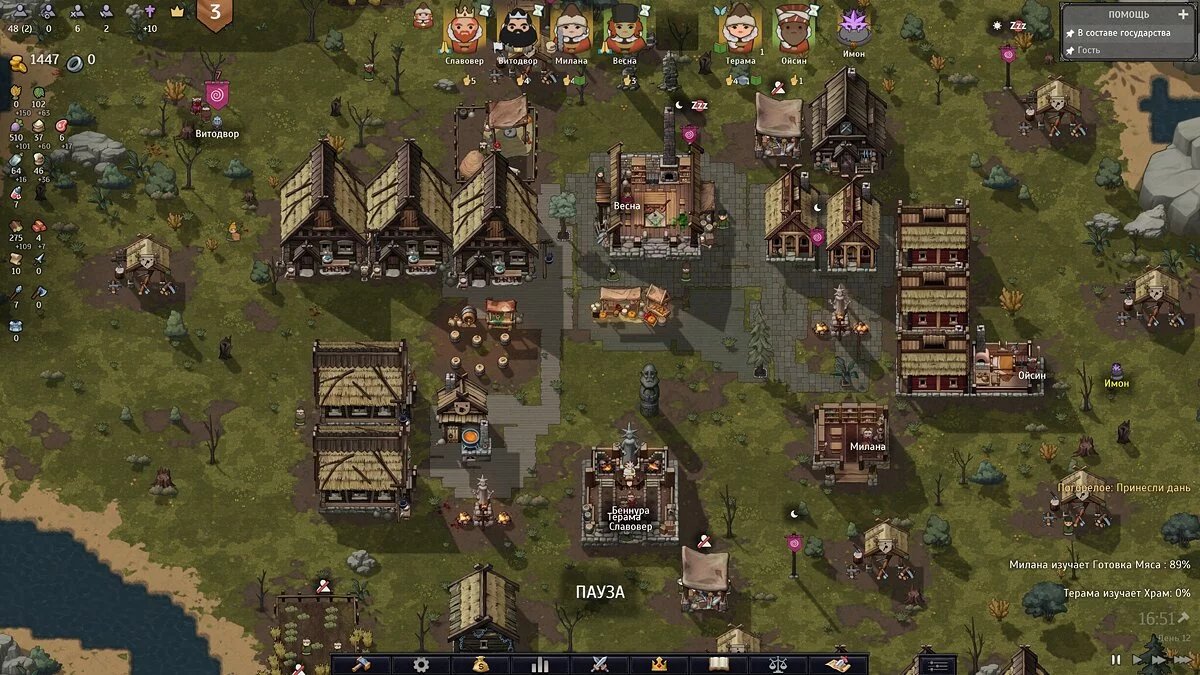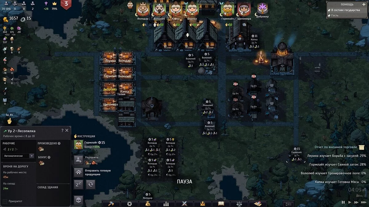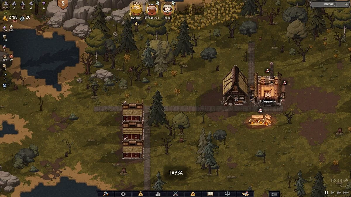 Теперь основные действия завершены. Снимите игру с паузы и наблюдайте, как персонажи начинают выполнять свои задачи, а крестьяне — строить. Установите приоритет на строительстве и улучшении лесопилок, так как древесина — главный ресурс в Norland. Чем быстрее она начнет поступать, тем лучше.