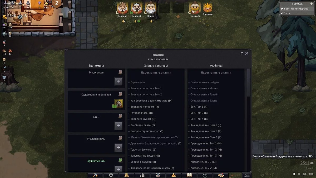 И здесь кроется ловушка: у другого лорда также может наступить полоса страшной занятости, что приведет к застою в изучении. Если это знание второстепенное, можно подождать. В ранней версии игры есть критически важные знания, промедление в изучении которых может привести к значительным задержкам в прогрессе. Проконтролируйте изучение угольной печи, мастерской и, наконец, канцелярии.