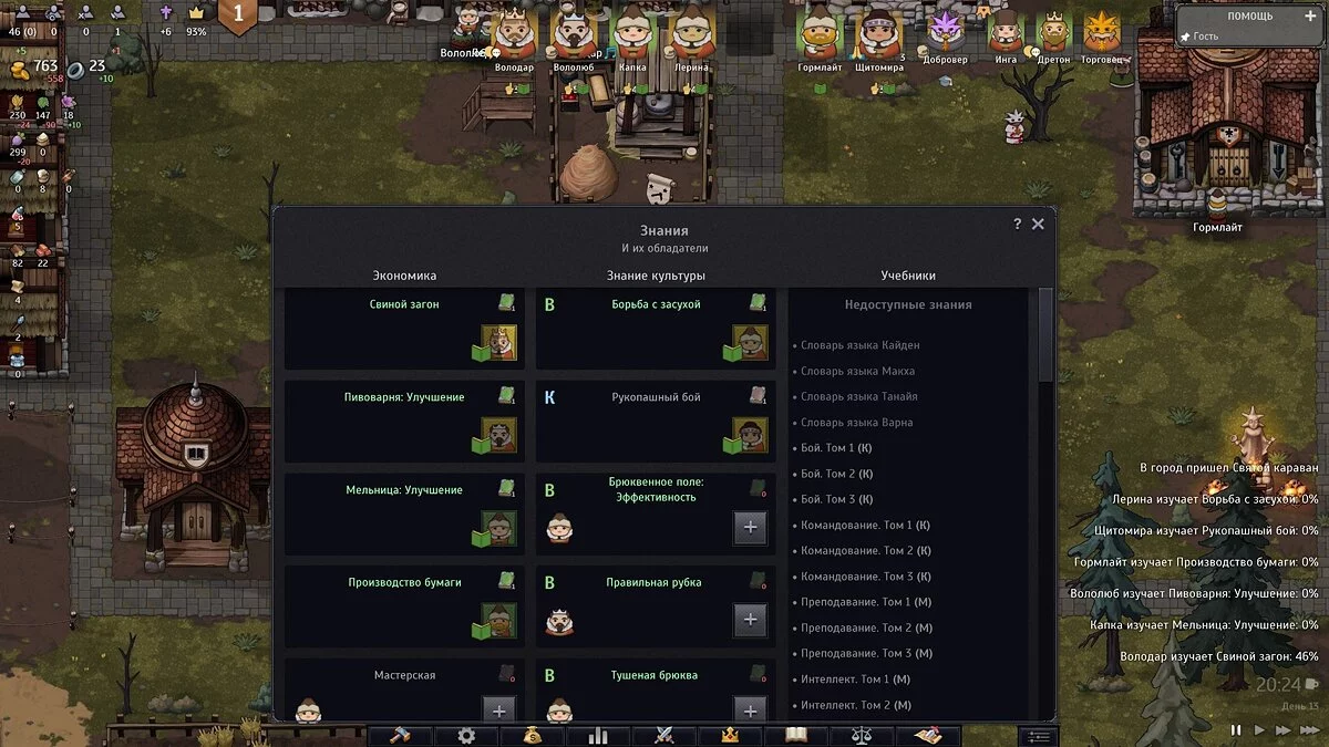 Откройте меню знаний. Проверьте доступные книги и отправьте самого умного лорда изучать одну из них, предпочтительно что-то полезное для торговли, например, мельницу или пивоварню.