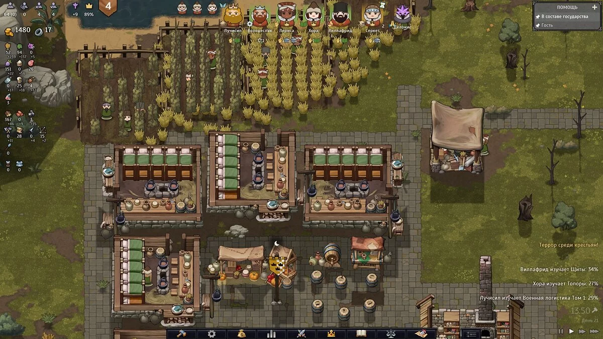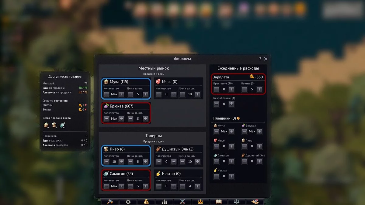 Для крестьян важно поддерживать баланс между заработанными и потраченными деньгами. Например, крестьянин заработал за день 10 золотых, и он может потратить 5 на муку и 5 на пиво. Если же он заработал только 8, то сможет купить лишь муку, а пиво — на следующий день. Или купит брюкву и самогон, а 2 золотых оставит себе. Вы можете установить зарплату с бонусом в 1-2 золотых, чтобы крестьяне могли чаще есть и пить, поддерживая их настроение и производительность.