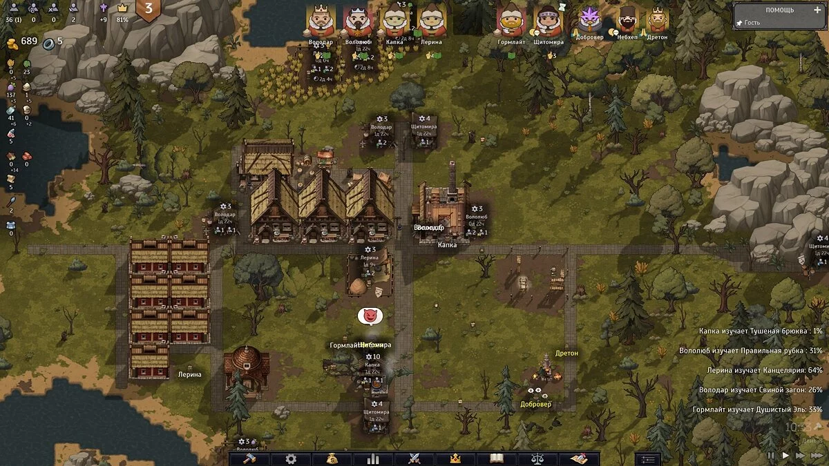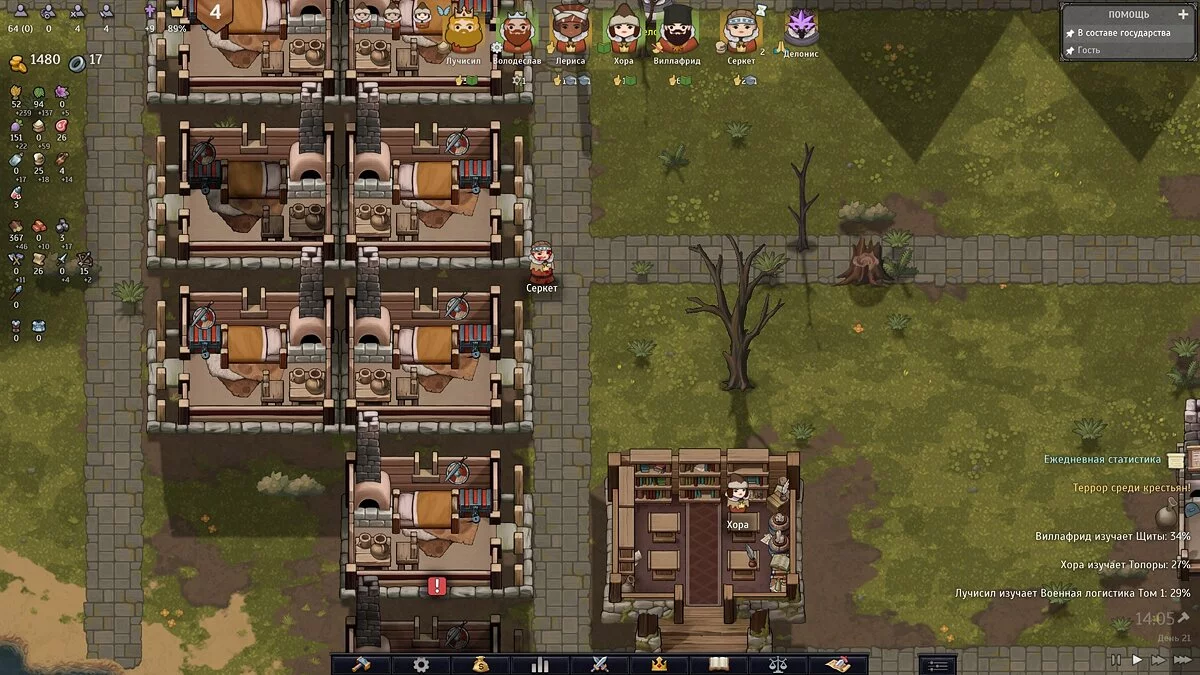 Наймите свободного лорда — идеально, если это будет мужчина с высокими показателями интеллекта, управления или торговли. Этот лорд в основном займется внутренними делами: будет изучать новые знания, покупать-продавать у Торговца, когда тот приходит в поселение, и, конечно, раздавать указания. Позже он сядет в канцелярию и будет рулить уже клерками, раздающими указания. Мне с таким повезло с первой попытки.