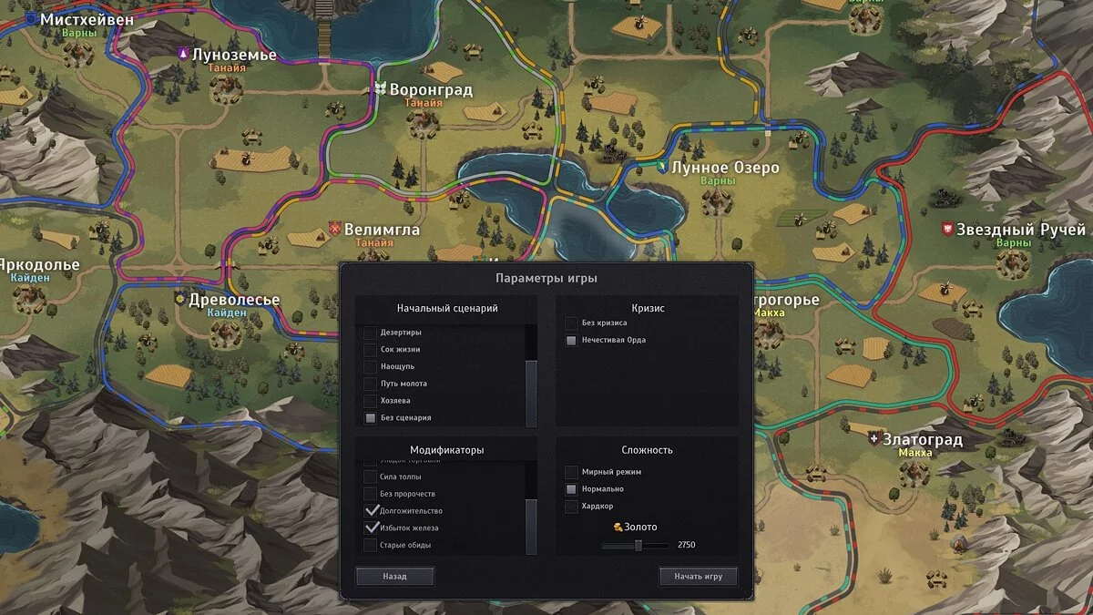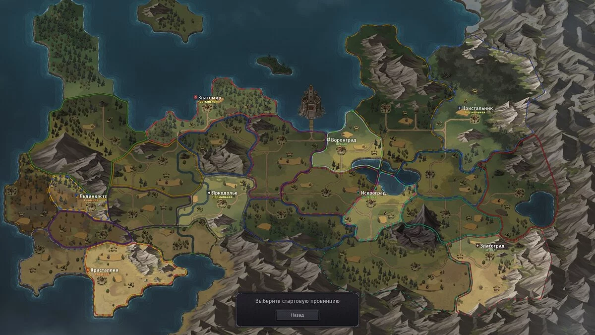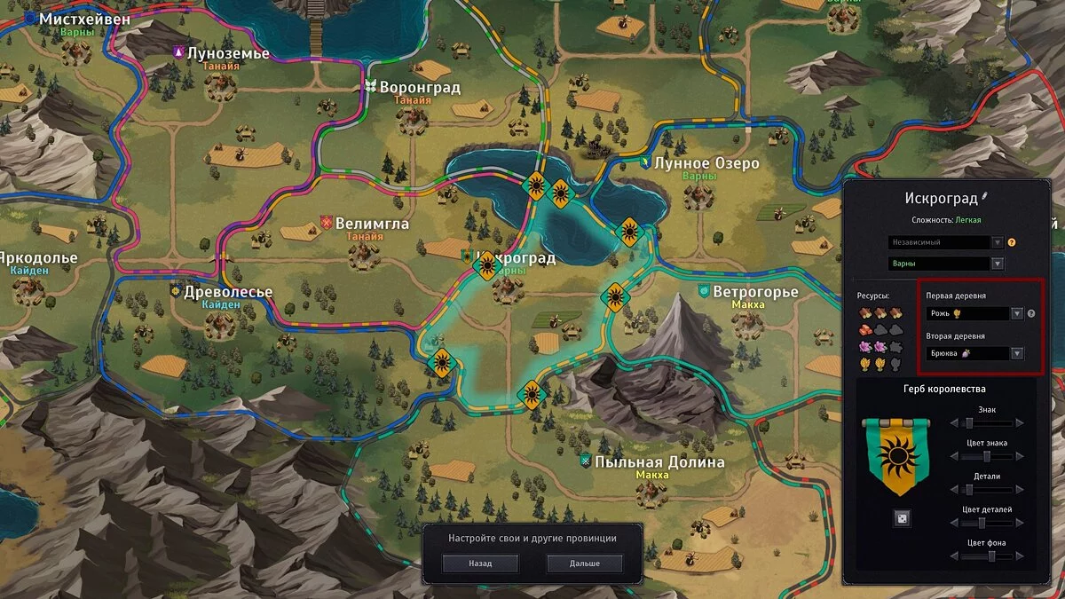А сейчас время других основных настроек. Первую партию в Norland лучше играть на принципах добрососедства и торговли, по крайней мере, на начальном этапе и в мидгейме. Оптимальная стартовая позиция — центр карты; выберите «Воронград» или «Искроград» и нажмите «Далее».