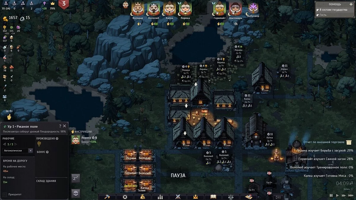 Для удовлетворения базовых потребностей города в еде вам понадобятся 4 поля: 3 для ржи (мука) и 1 для брюквы (самогон). Поле для брюквы может быть приоритетным, так как оно дешевле и позволит быстрее начать производство самогона. После этого займитесь выращиванием ржи.