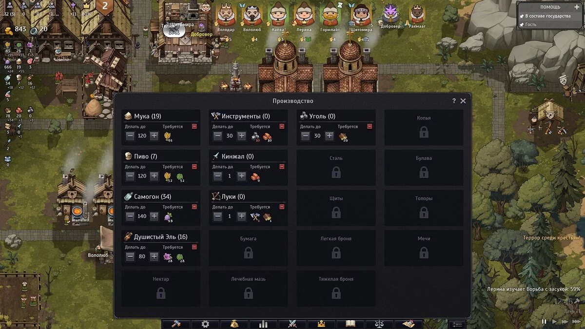Учтите особенность меню «Производство». Игра стремится автоматически включить режим производства товаров «произвести до N», например, до 30 единиц инструментов, с отслеживанием произведенного количества. Как только будет достигнуто заданное количество производство остановится и мастерская прекратит работу. Чтобы этого не произошло с важными ресурсами, советуем устанавливать режим «делать до N», тогда запасы будут пополняться постоянно.