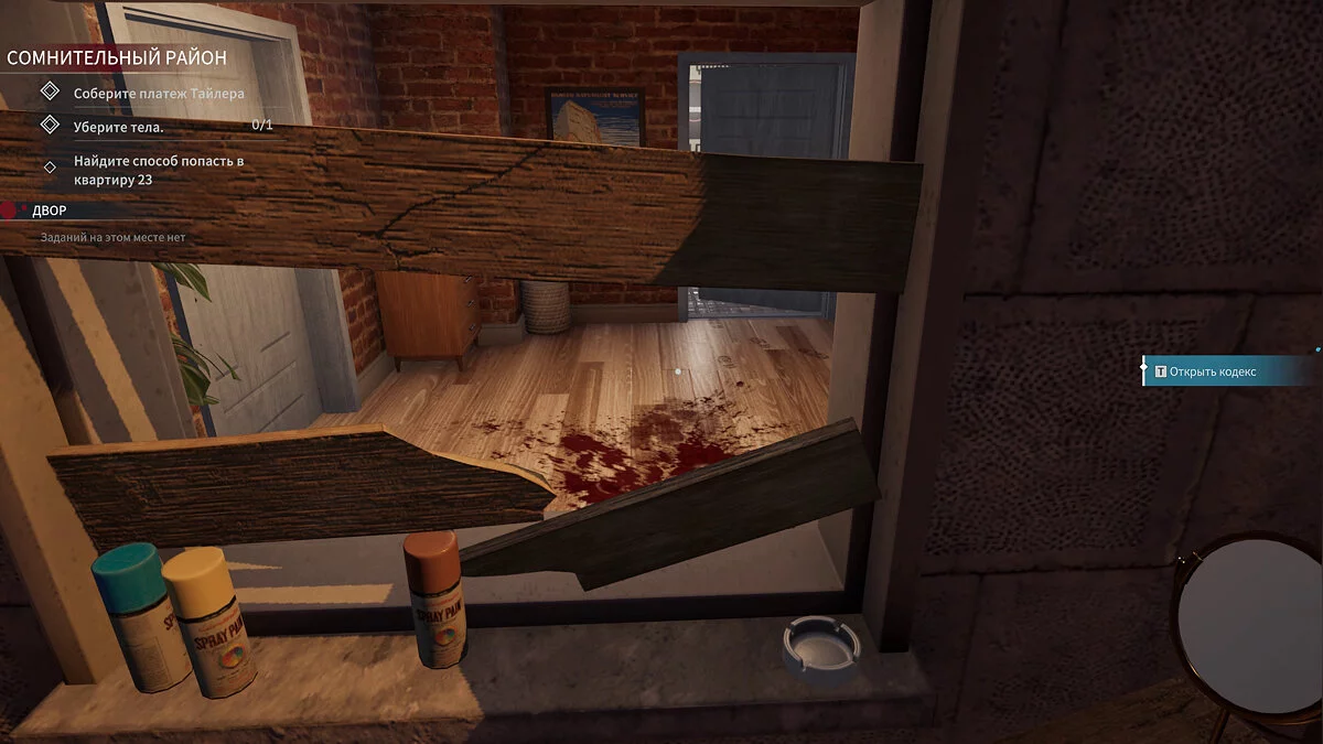 После вступительной заставки, вы окажетесь на улице, возле заброшенного дома. Нужно подняться на второй этаж в квартиру № 23. Сделать это лучше через заброшенную квартиру на первом этаже. Чтобы попасть в это помещение, поднимитесь в подъезде на один пролёт и разбейте доски на входе. В крайней комнате подберите счастливый ключ № 1 и ценную вазу. Вылезайте через окно на пожарную лестницу и поднимайтесь к квартире № 23. Прежде чем зайти внутрь, пройдите вдоль карниза к строительной люльке. У окна разбейте доски и откройте его. Это пригодится позже, чтобы быстрее избавляться от мешков с мусором и трупов. У окна подберите улику № 1 — блокнот.
