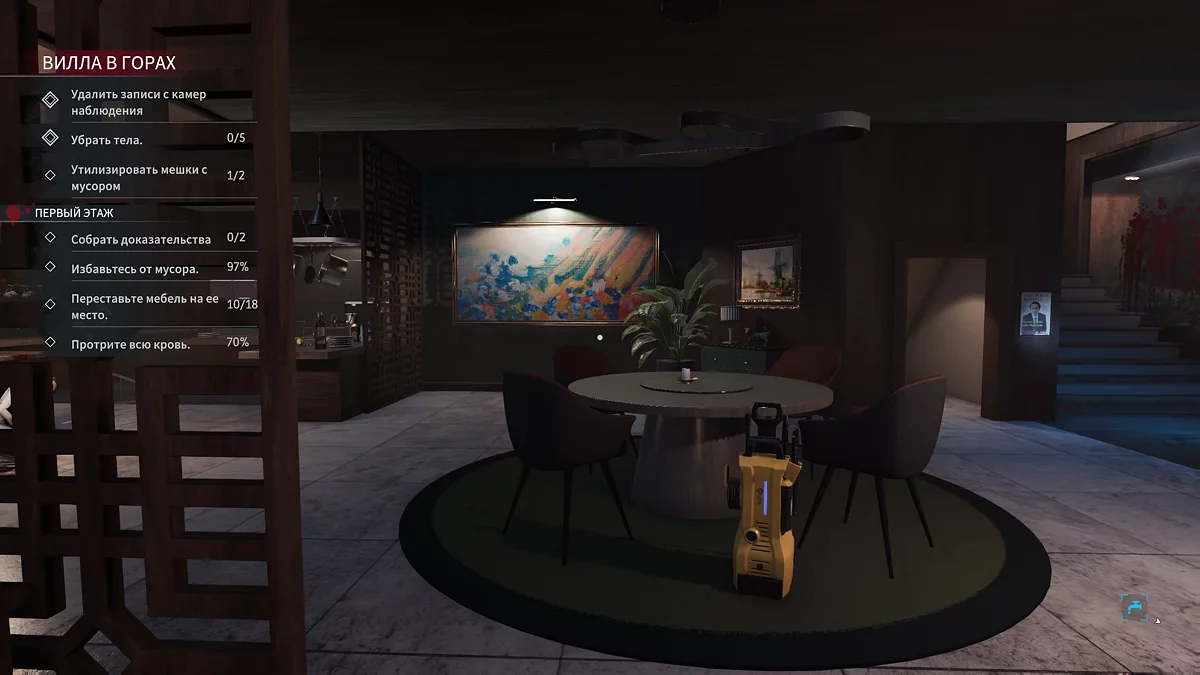 Улучшите вместительность мешков для мусора и возможность их совмещать (если бросите рядом). Локация длинная, поэтому это поможет сэкономить много времени и сосредоточиться на сокрытии улик. Также советуем улучшить фонарик, чтобы не расставлять лишние приборы.