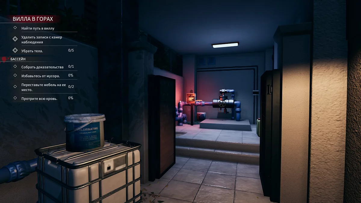 Попав в виллу, поверните направо и включите насос, чтобы опустошить бассейн. Поставьте озонатор в центр, отмойте область вокруг бассейна и уберите мусор. Если вам мешают надувные игрушки, то можете их выбросить на баскетбольную площадку. Они все чистые. В центре бассейна можно найти ключ от мастерской, который открывает дверь, справа от насоса. Стул из бассейна нужно вернуть за стол, недалеко от ступенек.
